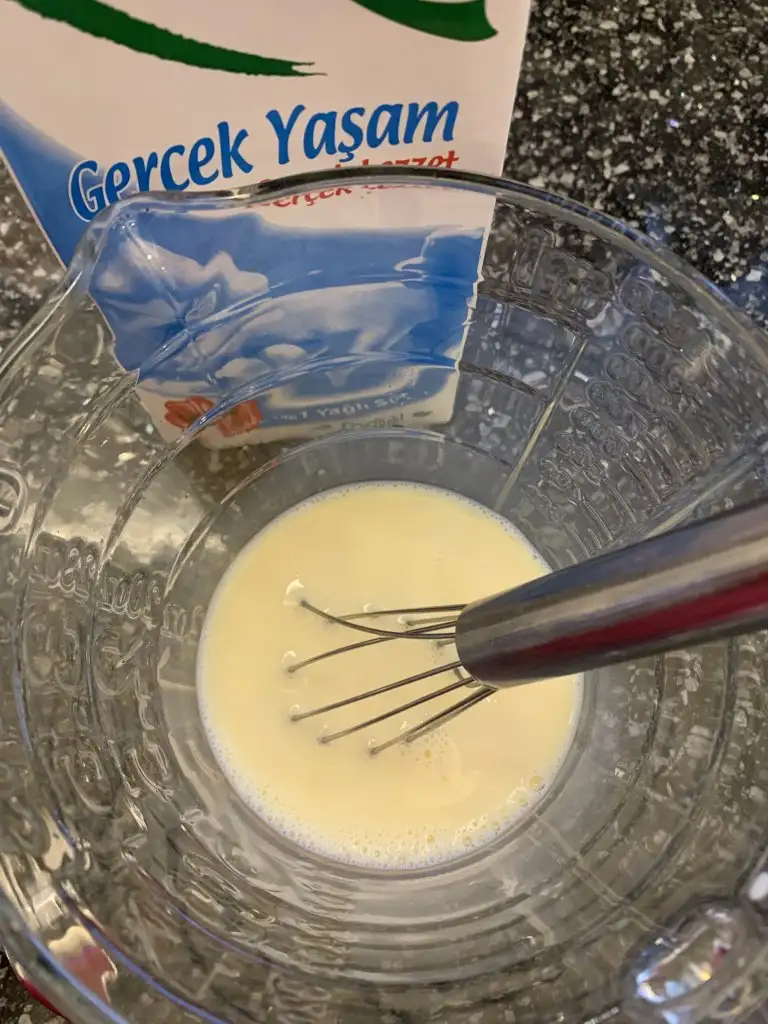 - Karıştırma kabımıza 3 adet yumurta, 1 su bardağı sıvı yağ, 2, 5 su bardağı süt ve tuzunu ilave edip karıştıralım.