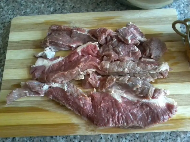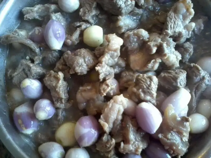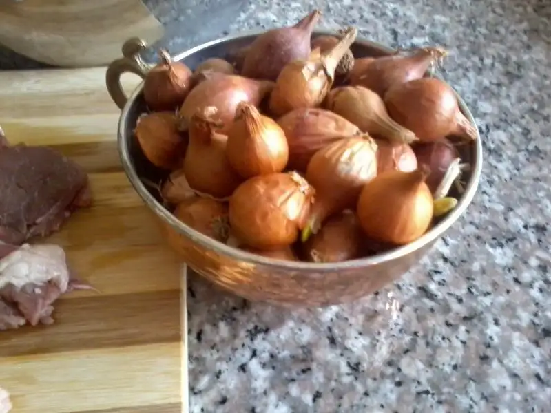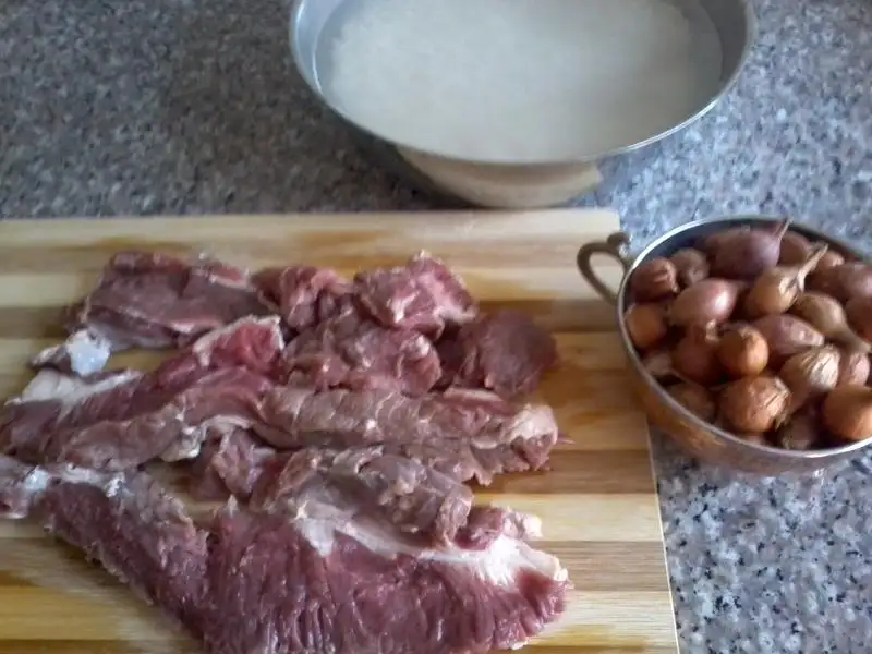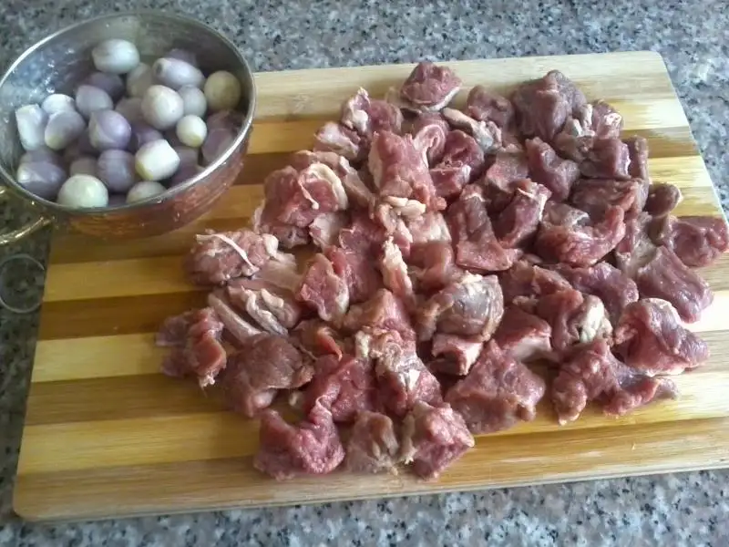 Diğer yandan arpacık soğanlarımızı temizliyor,etimizi iri kuşbaşı şeklinde doğruyoruz.