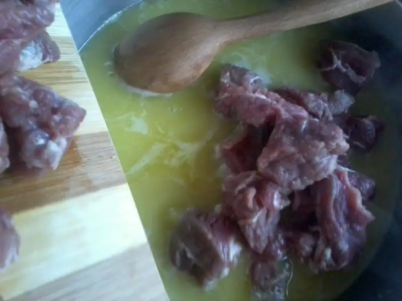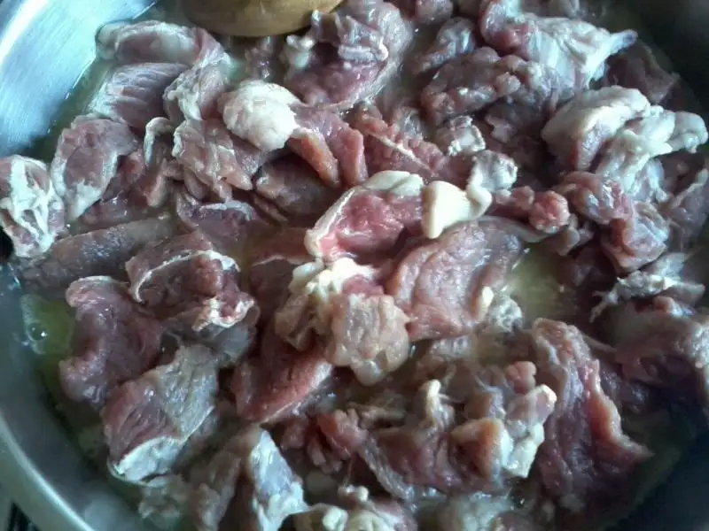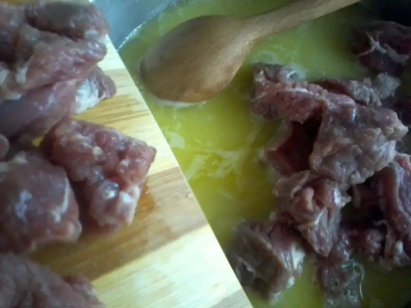 Tuzlu tereyağımızı geniş ve derin bir tavaya ekleyip yanmayacak şekilde eritiyoruz ve ardından ilk önce kuşbaşı doğradığımız etlerimizi ilave ediyoruz.
