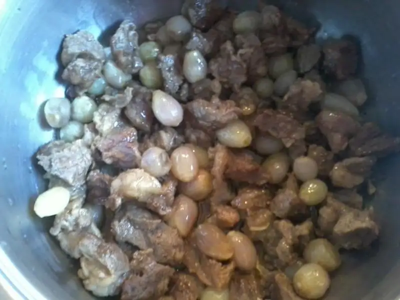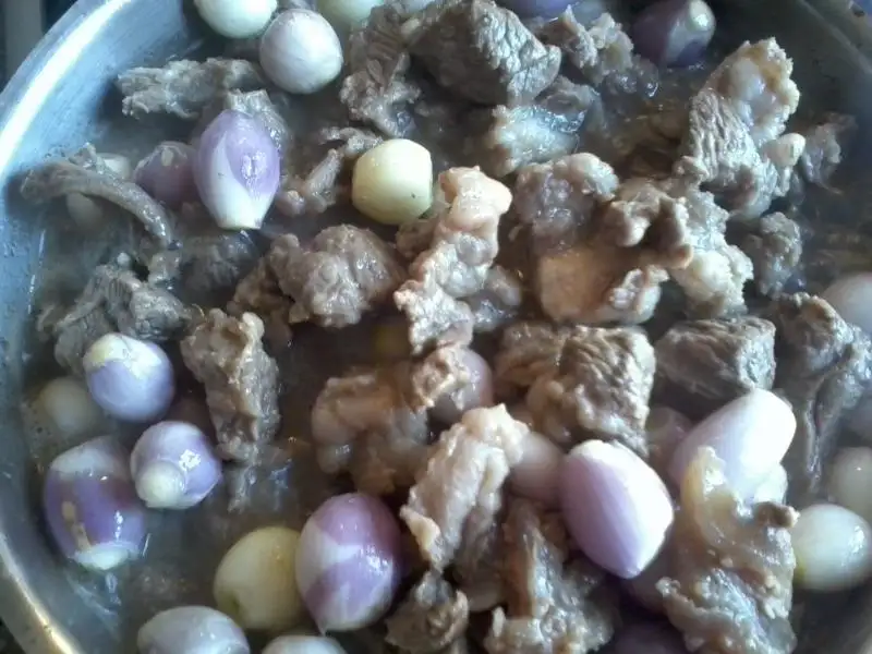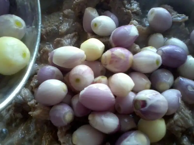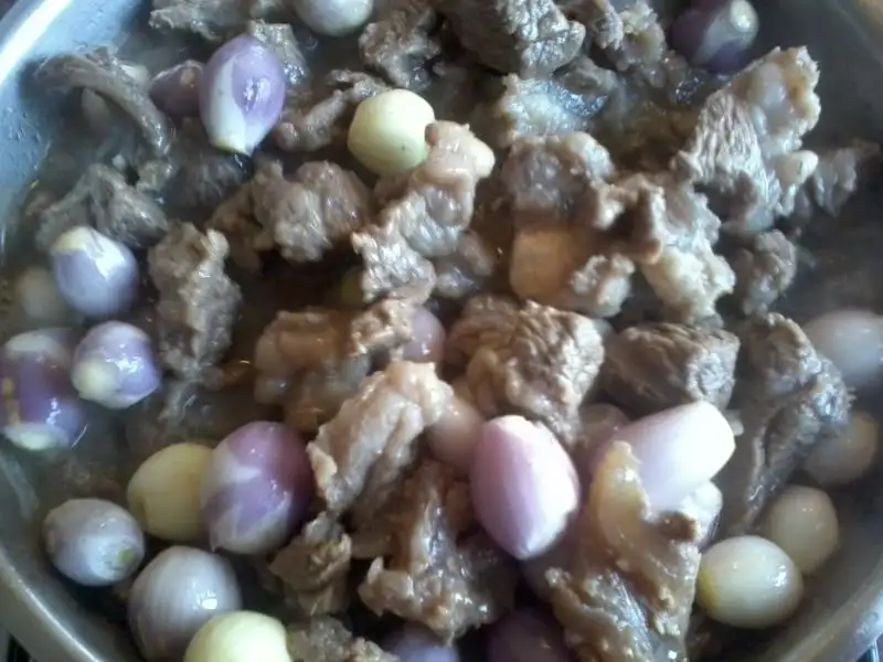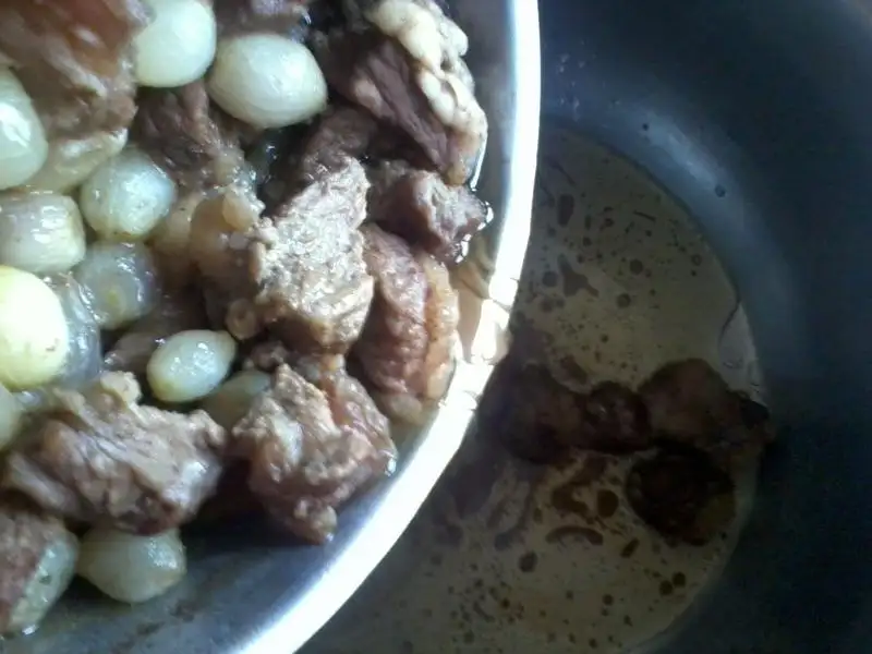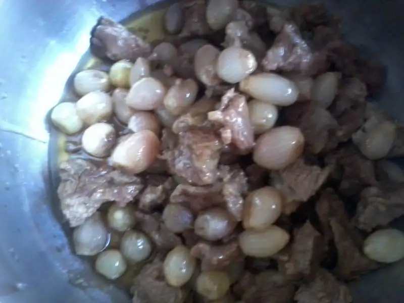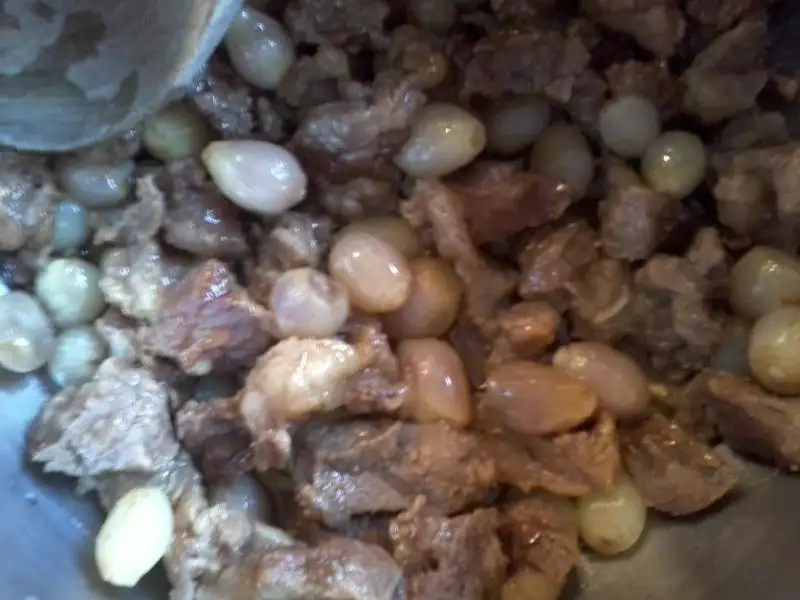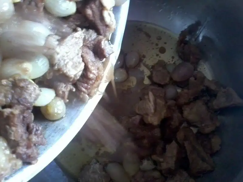 Etlerimiz mühürlenip suyunu bıraktıktan sonra suyunu çekmesini beklemeden arpacık soğanlarımızı etlerimize ekliyoruz.