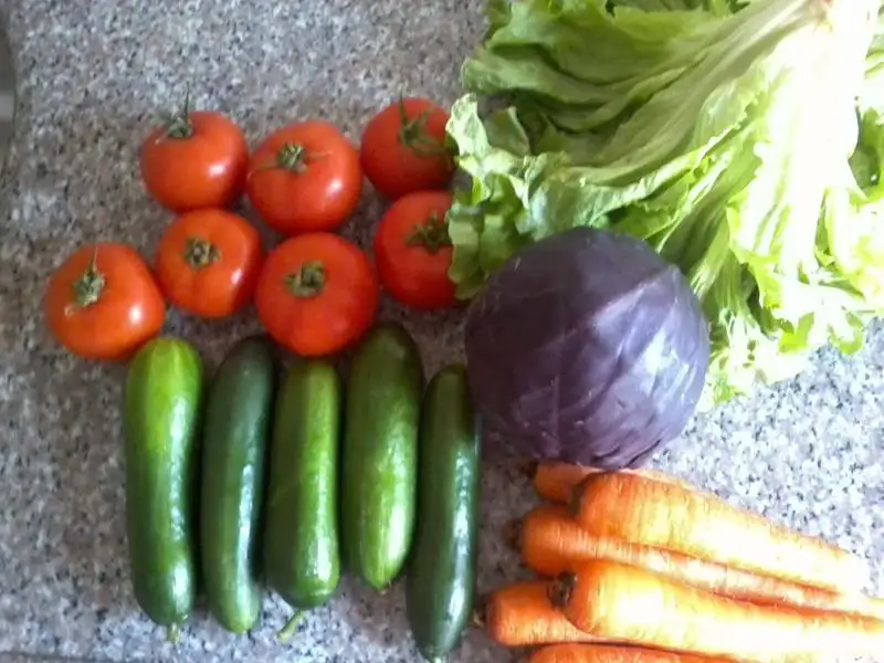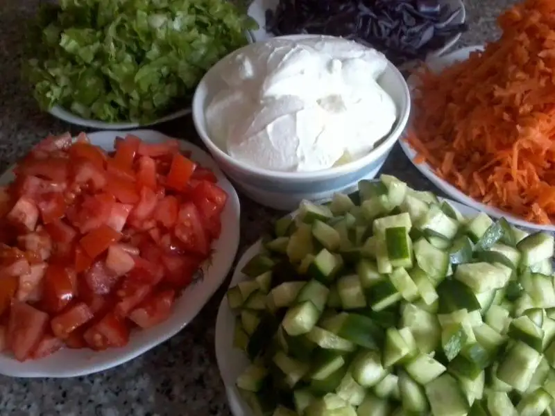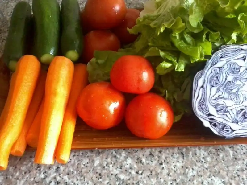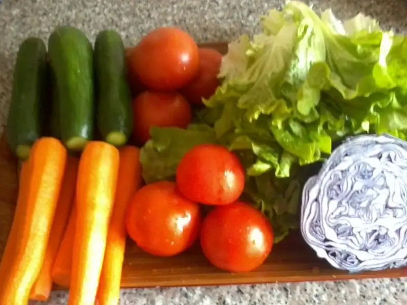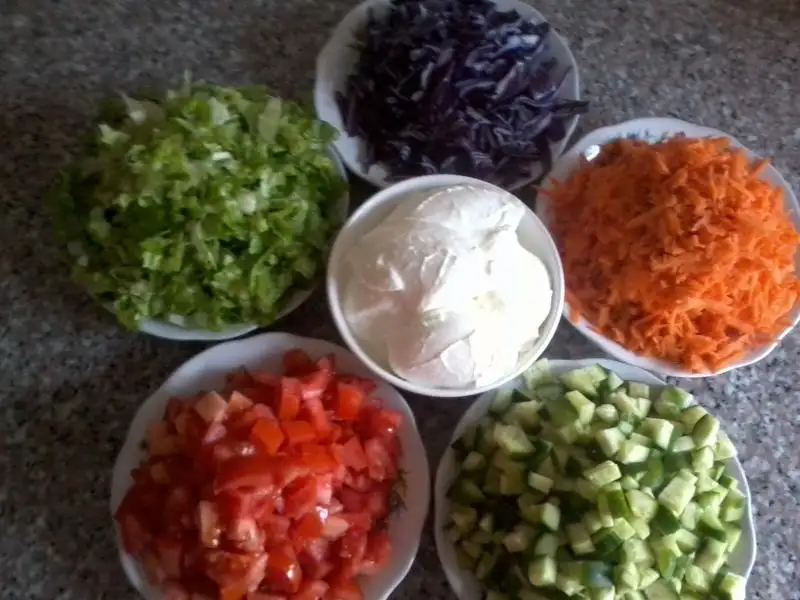 Pilavımız pişerken süslemek için salatalık malzemelerimizden domates,salatalık,marul ve mor lahanamızı iyice yıkayıp süzüp istediğimiz ölçülerde doğruyoruz.