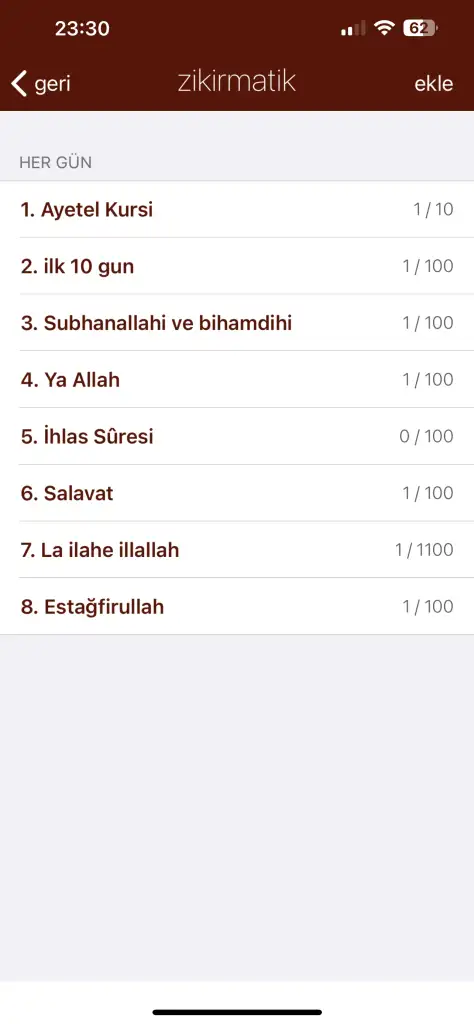 yo bende zikir matikle yapamiyorumda tesbihlr yazamiyorim bi kenara zikirmatiklere not almak iyi oliyor ne okuyacagimi hatirliyorimBende ezan vakti diye bı uygulama var. İstediğin başlığı oluşturup oradan tesbih olarak çekiyorsun. Kendi hafızasında kalıyor. Ben boncuklara dokunamadan çekince güvenmiyorum onlara elime o toplar değecek
