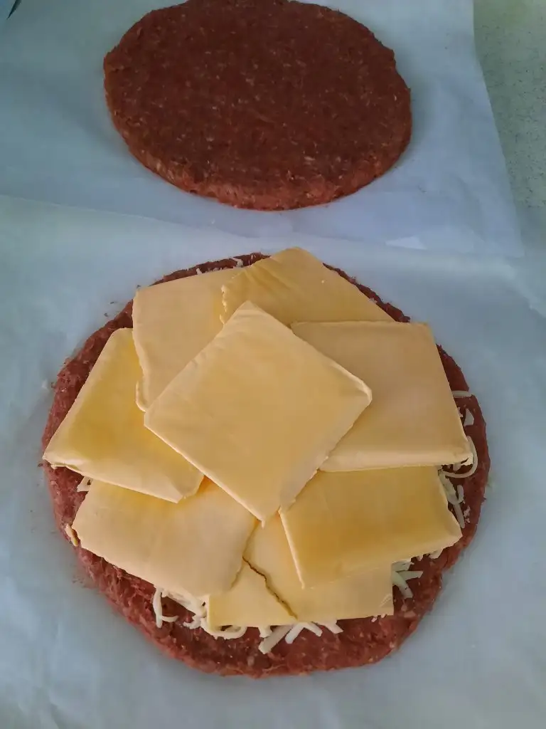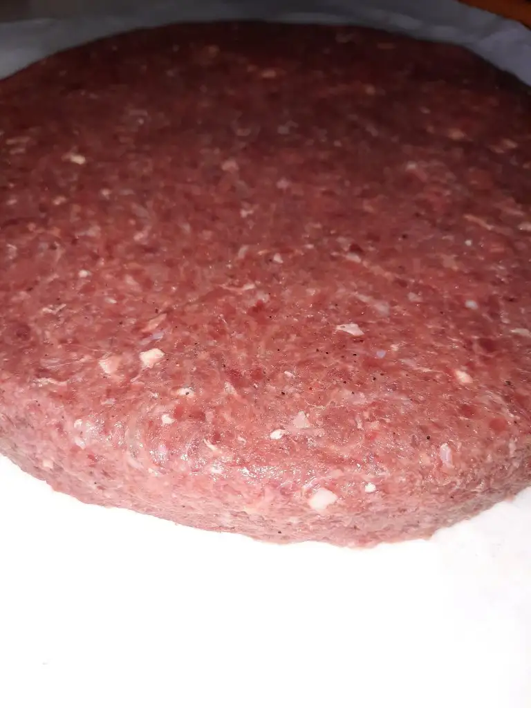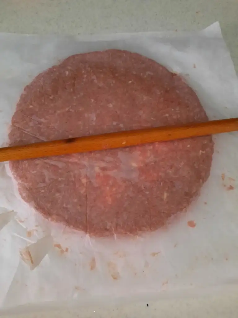 Kıymamızı ikiye bölüp (1 kilo kıyma mangal teli için büyük geliyor,ben 500 gr kullandım kalanı dolaba attım) her iki parçayı da yağlı kağıt arasına koyup oklava ile 1 cm kalınlıkta açıyoruz.