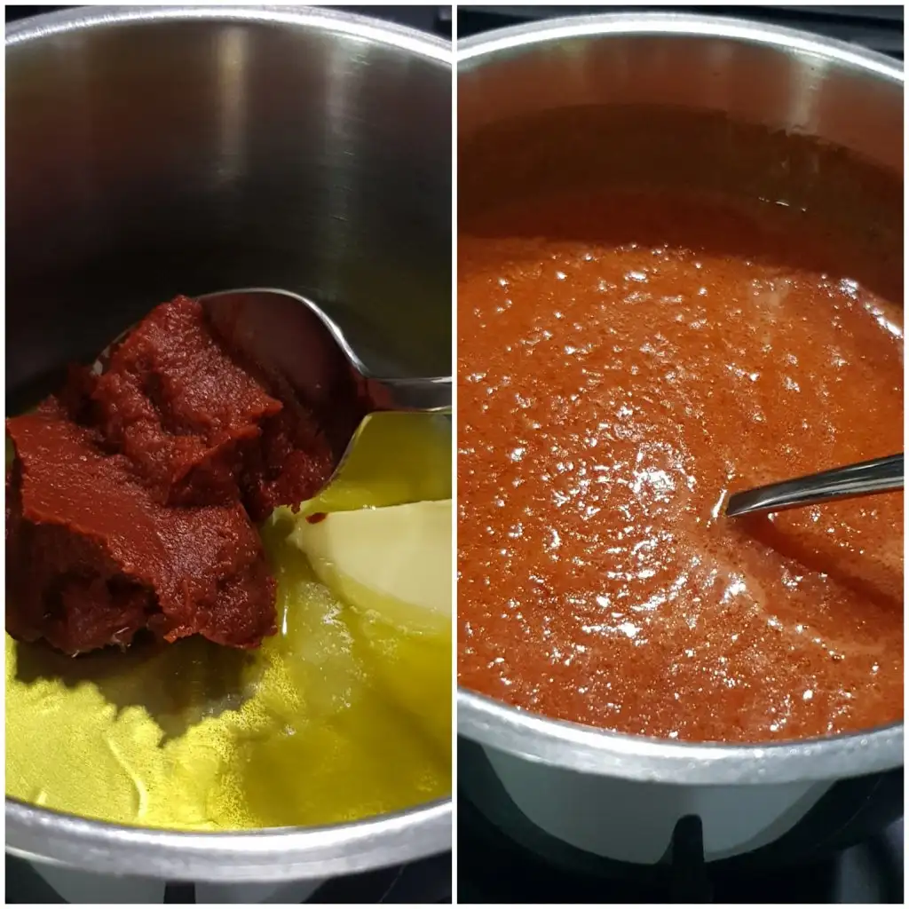 Zeytinyağı ve tereyağını sos tavasına alıp üstüne salçayı ekleyip kavuralım, üzerine kabuğu soyulmuş, püre hale getirilmiş domatesleri ekleyelim, biraz kaynar su ekleyip, kaynamaya başlayınca, 10 15 dakika kısık ateşte pişirelim .