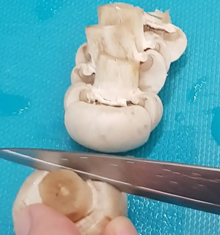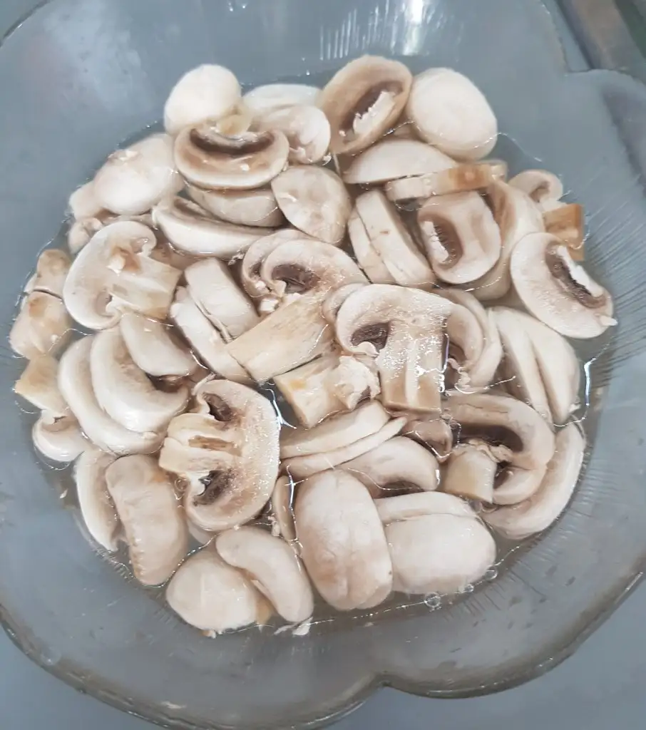 Mantarlar ince ince dilimlenir, yarım limon suyu sıkılmış ve biraz su eklenmiş kaseye mantarlar koyulur, 5-10 dakika kasede bekletilir. Böylece mantarların kararması önlenir.