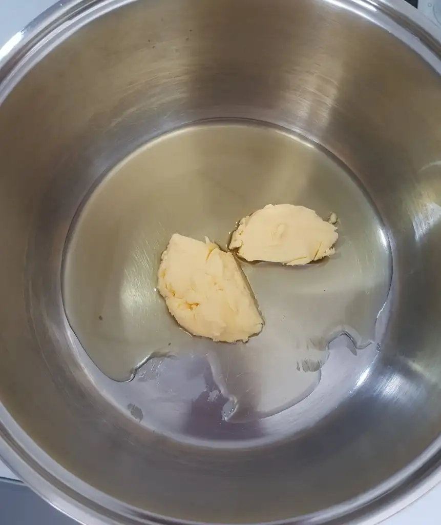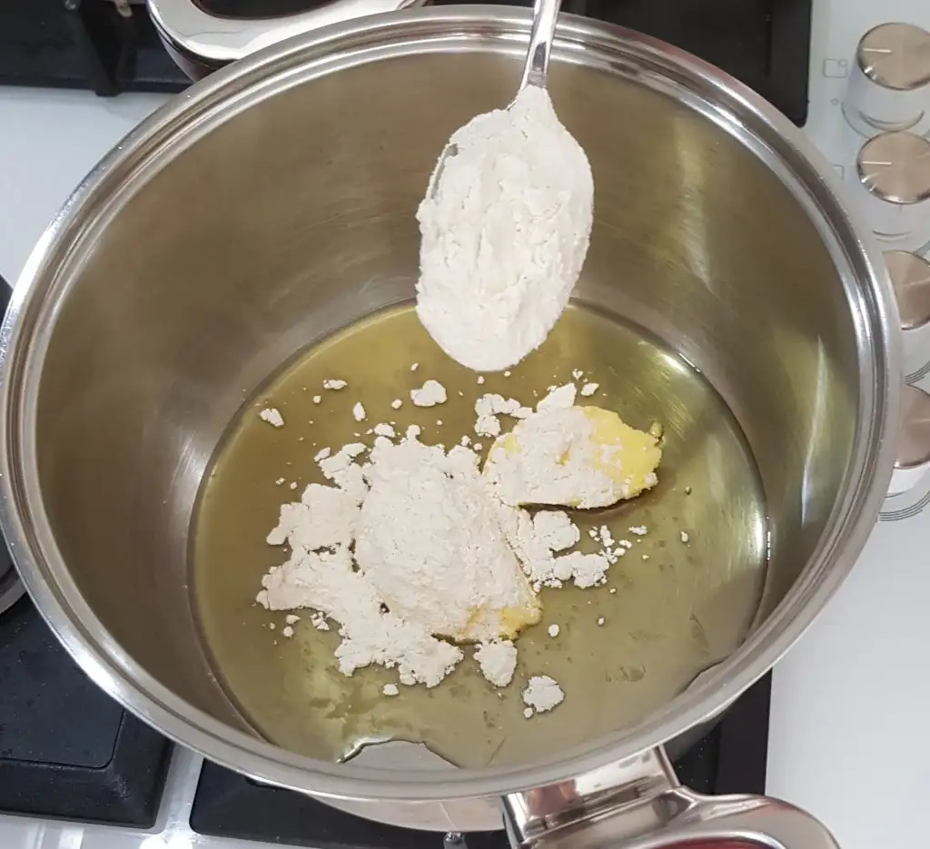 Mantarlar limonlu suda beklerken, tencereye tereyağı ve zeytin yağı konulup üzerine un ilave edilip unun kokusu çıkana kadar kavrulur.
