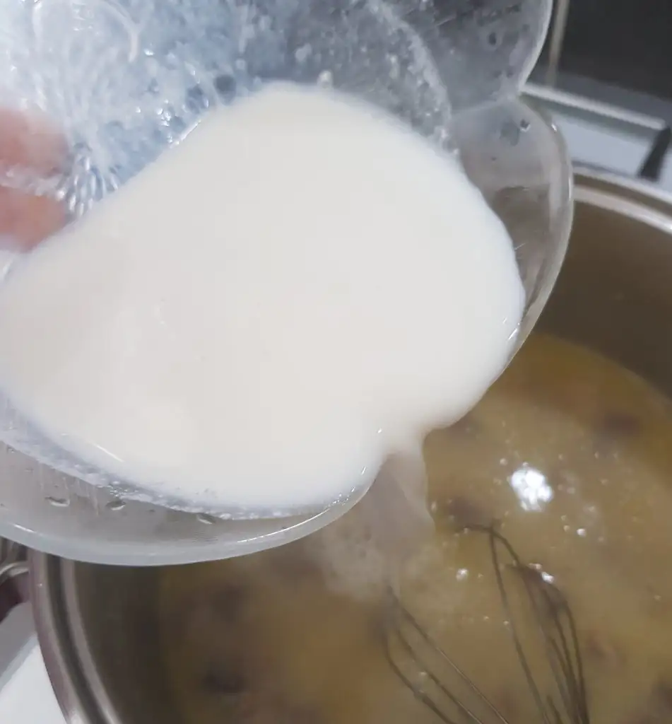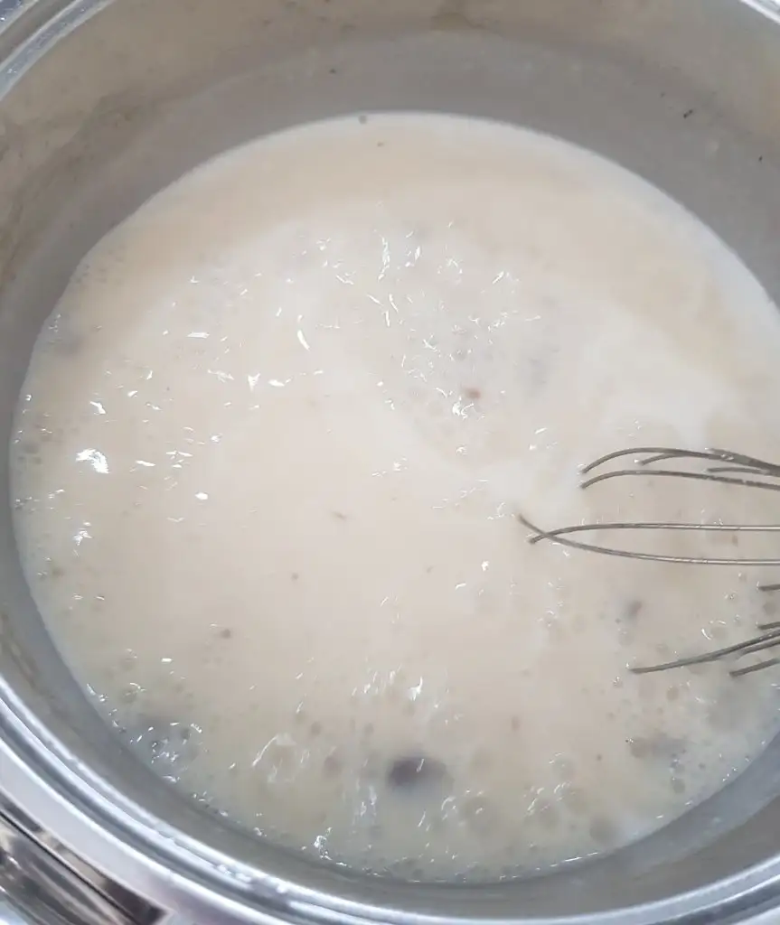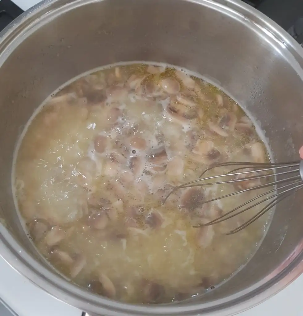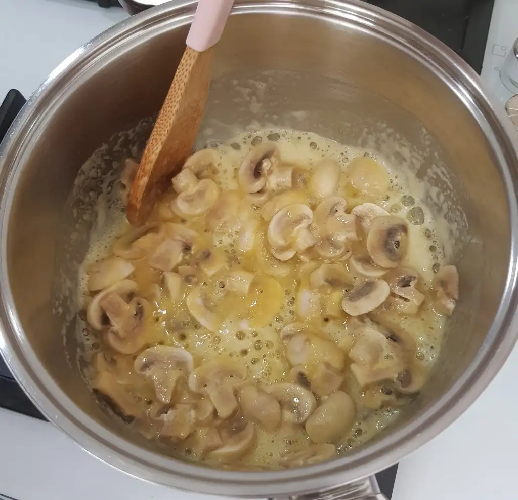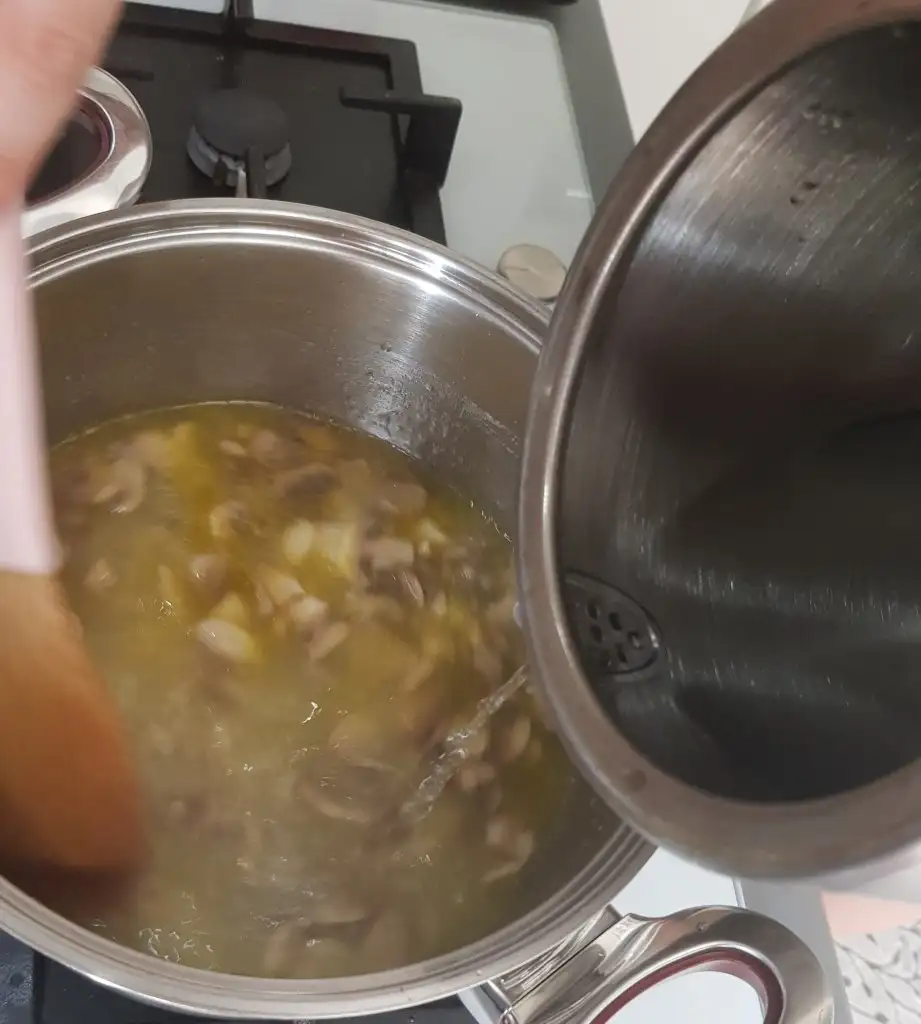 Mantarların suyu süzülür ve tencereye alınarak unla beraber kavrulmaya devam edilir. Mantarlar suyunu salıp tekrar suyunu çekince 1 litre kaynamış su eklenir , unun topaklanmaması için el çırpıcısı ile 5 dakika karıştırılmaya devam edilir.