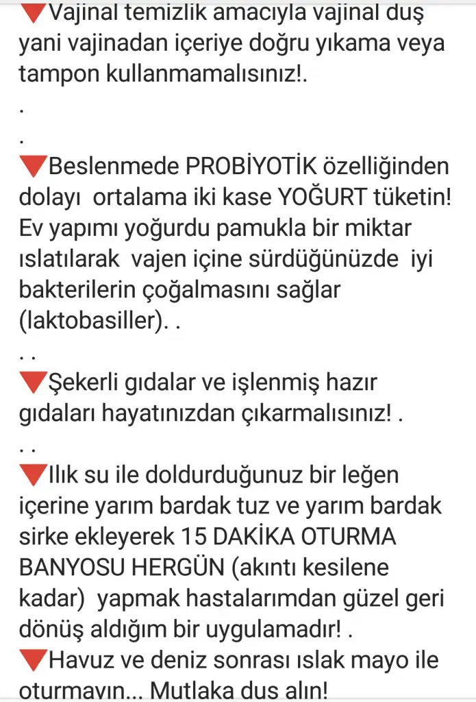 3.her gun 3 su bardağı pastörize edilmiş (hazır) yogurtlardan yencek yada bi şırıngaya yogurt çekilip vajınanın içine enjekte edılcek..