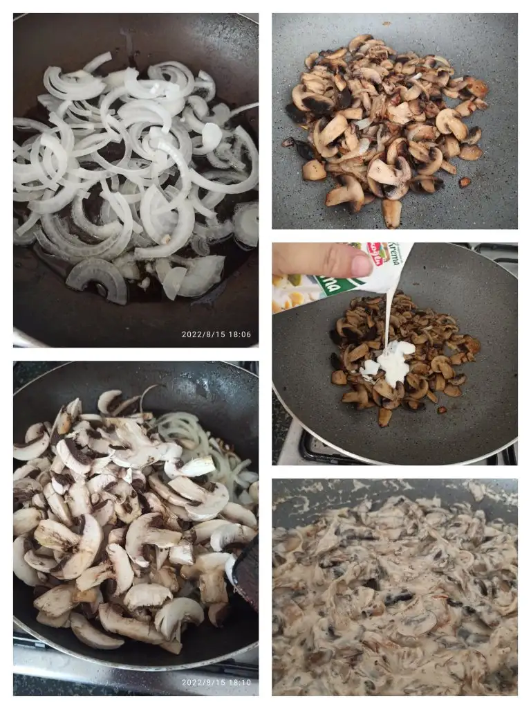 Mantar soslu kısmı hazırlamak için 1 adet soğanı piyazlık doğrayıp karamelize olana kadar pişiriyoruz..mantarları ekliyoruz.mantarlar ı da kavurup sıvı krema ekliyoruz.krema biraz çekince tuzu ve karabiberi ekleyip alıyoruz ocaktan..