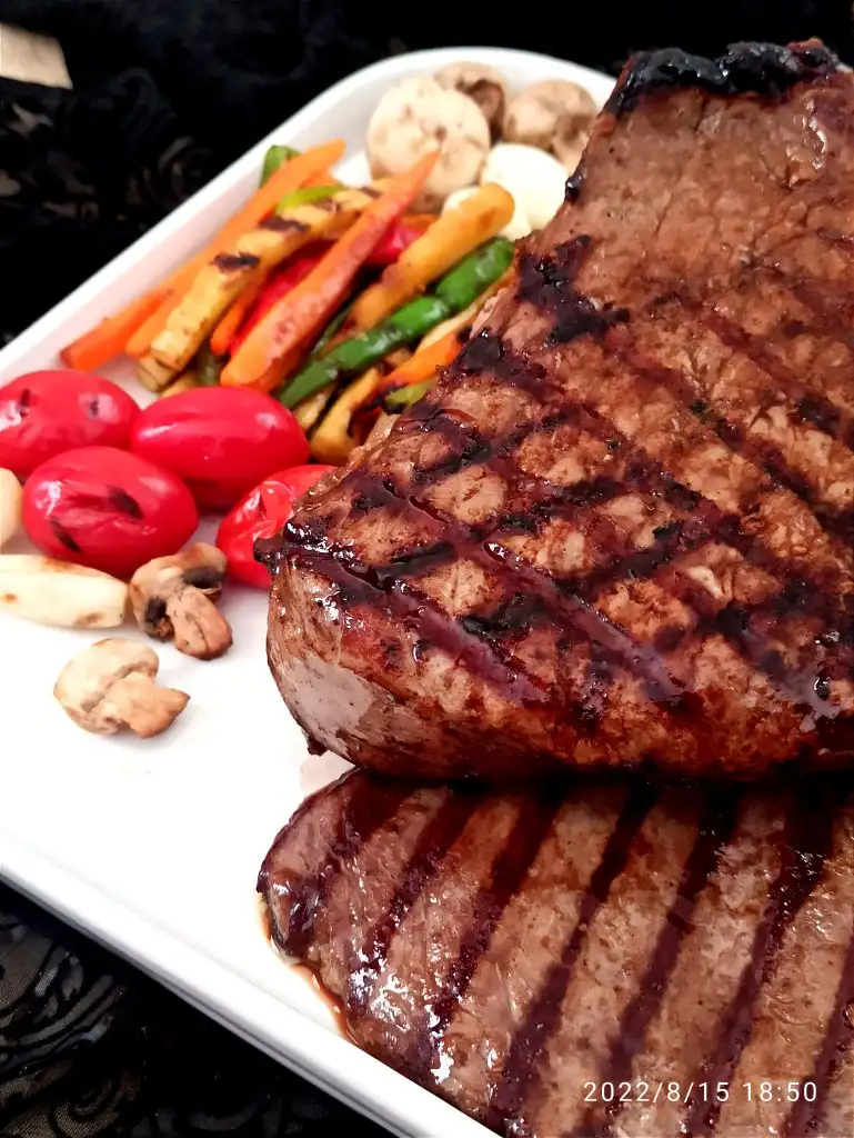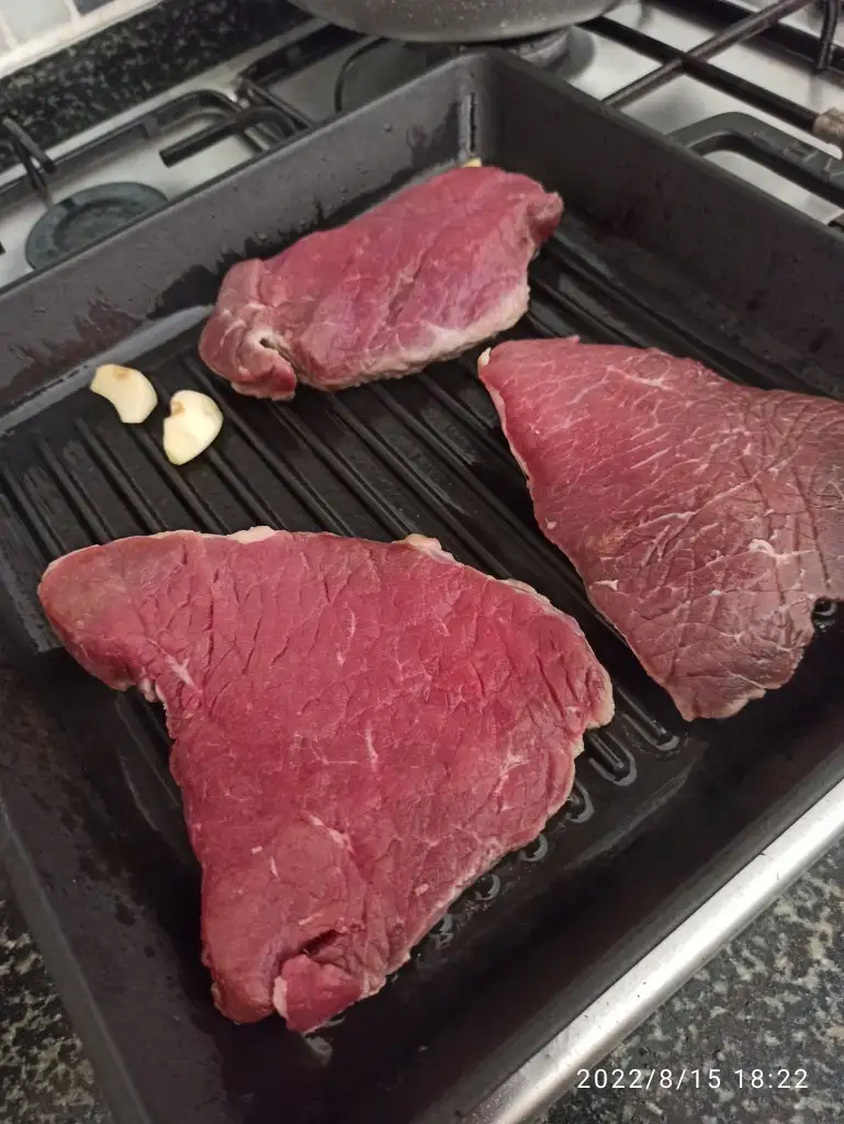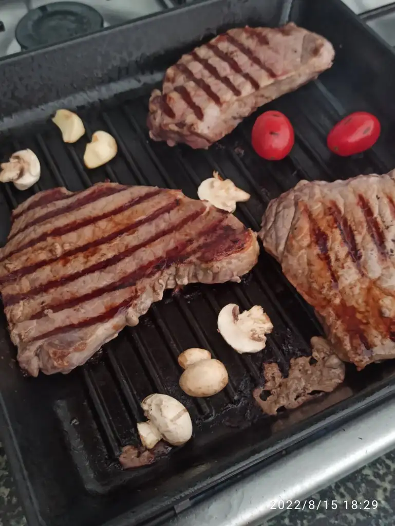 Sonrasında iyice ısıttığımız döküm tavayı yağlıyor ve etleri koyup arkalı önlü pişiriyoruz...ben iki tarafı da ayrı ayrı 4 er dakika pişirdim.b un esnada tavaya sarımsak biberiye ve sevdiğimiz sebzelerden koyabiliriz...