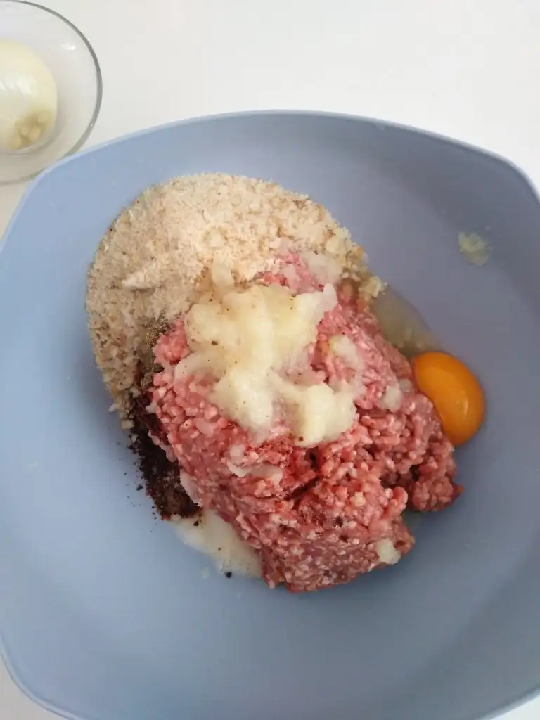 Kıymaya yumurta, galeta unu, 1 tatlı kaşığı tuz, birer çay kaşığı karabiber, pulbiber, kimyon ve rendelediğimiz soğanı ekleyip yoğuruyoruz.