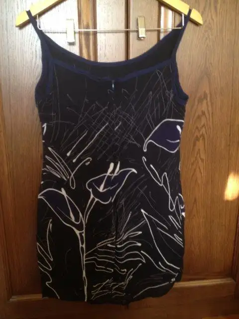 5- Yılbay Collection lacivert desenli şifon elbise. İçi astarlı. Arkası fermuarlı. Kullanılmadı. 40 bedene göre. 10 tl.