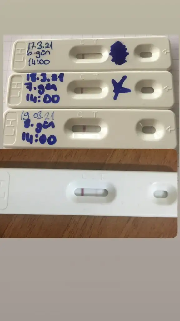 Kızlar iyi geceler aşırı akıntım ve kasık ağrım hele ağrı sanki şuan ben hasta oluyorum o kadar söyliyim bende test yapayım dedım sabah zaten yapmıştım sizlede paylaşıyım dedım.sizce de son resımde ki testde ki çizgi biraz daha belirgin değil mi gecen ay 15.gunde yakalamışdım hemen hemen bu kadar cabuk koyulaşırmı?