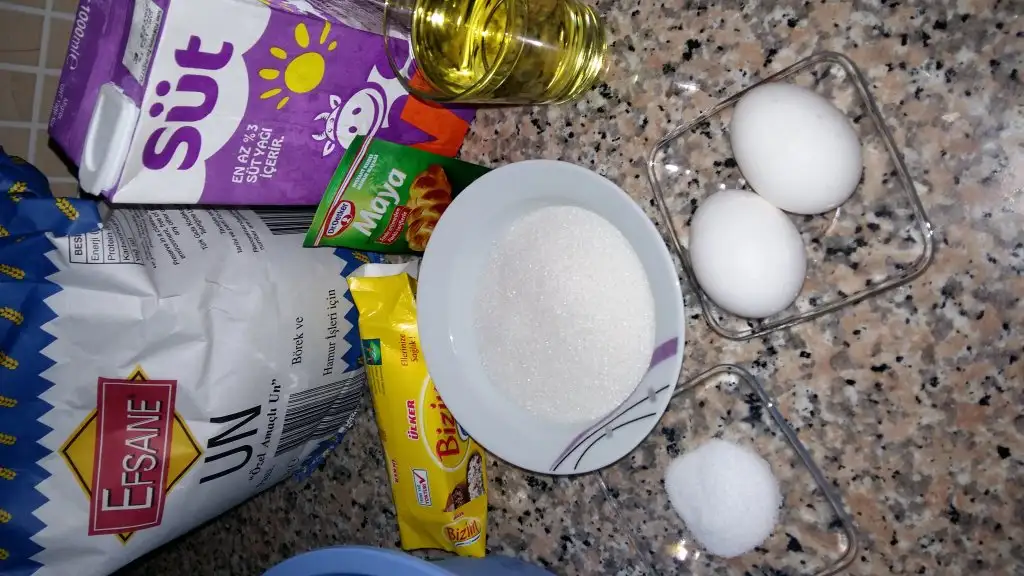 2yumurta(1 sarısı üstüne ) 2buçuk su bardağı süt 1su bardağı sıvıyağ Yarım margarin 5 yemek kaşığı şeker 1 tatlı kaşığı tuz 1paket Kuru maya Aldığı kadar un