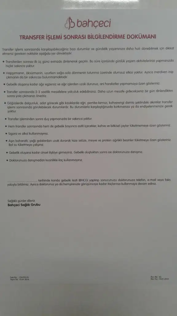Canım tabi ki günlük hayatımıza devam ediyoruz ama tedavi boyunca dikkat etmemiz gerekenler var. Mesela transferden sonra ağır iş yapmak evi bile süpürmek yok stres yok. Yavas hareketler yapicaksin Onun haricinde herşey rutin şeyler. Bunlari transferden sonrasi yapmaman lazim