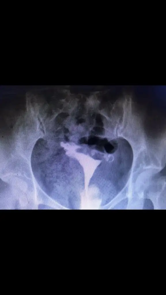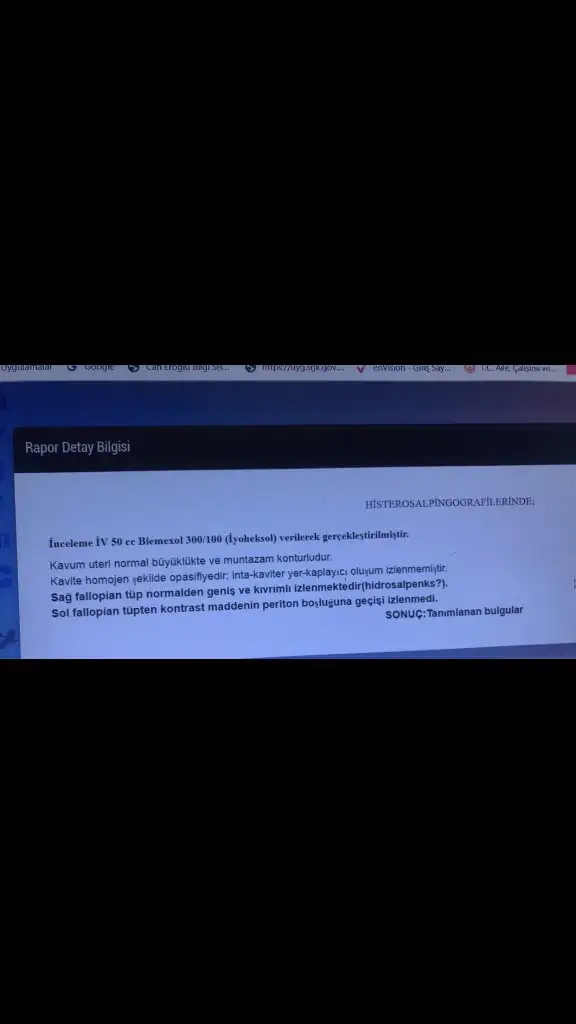 Sol tüp kapalı, sağ tüp olması gerekenden daha geniş ve kıvrımlı( hidrosalpinks) . Doktor muhtemelen kapalı tüpünün de şekli sağdaki gibidir dedi ameliyat olmak yerine tüp bebek yaptım. Çünkü ameliyat olsam bile %50 ihtimalle tüp bebek yaparız dedi ben de o yolu seçtim.