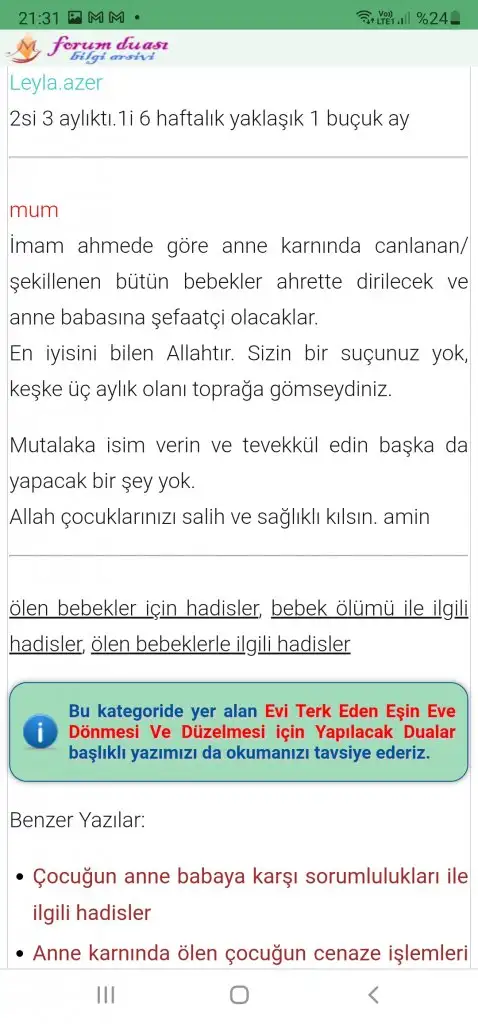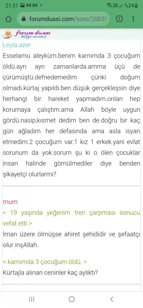 Kızlar, anne karnında ölen bebek veya bebeklere isim verilmesi ve onların gömülmesi gerektiği konusunda ayetler var. Ben de internette dolaşırken şimdi gördüm. Daha önceden teselli cümlesi olarak "bebeğin ahirette senin cennete giriş kapın olacak" şeklinde cümleler duymama rağmen aslı astarının olup olmadığını bilmiyordum. Sizler ne düşünürsünüz bu konuda merak ediyorum ve site urlsini aşağıya bırakıyorum.