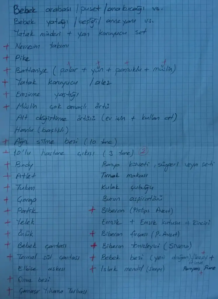 Yeni doğum yapmış tecrübeli birkaç arkadaşın ortak fikriyle oluşturulmuştur. Kişiye ve maddi duruma göre gereksiz gelenler elenebilir veya farklı markalardan alınabilir.