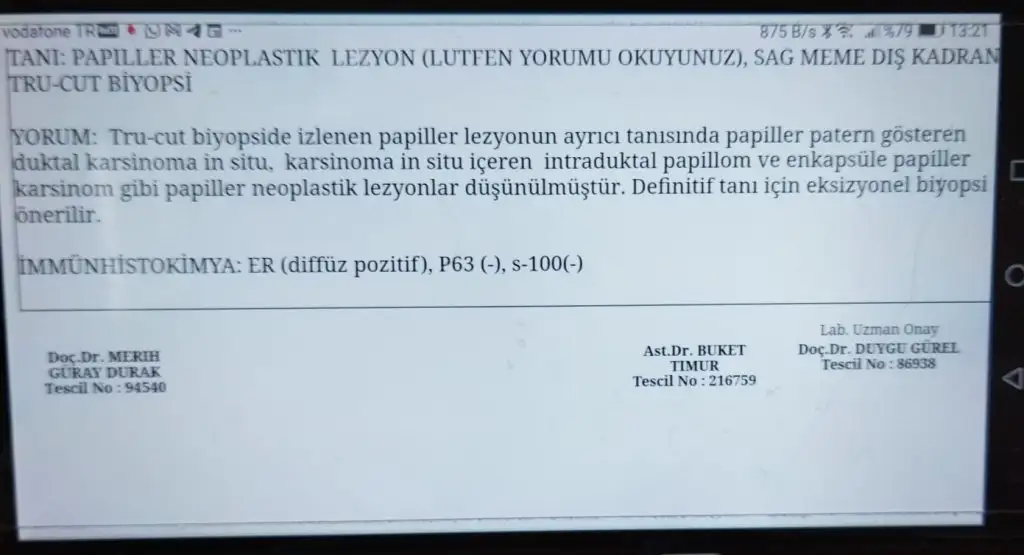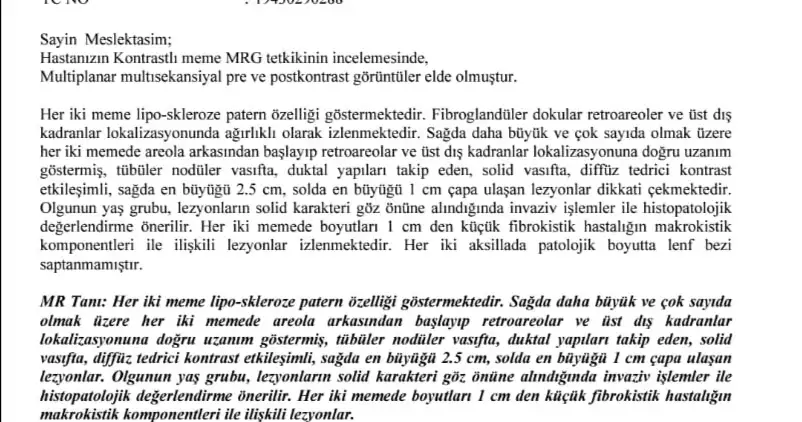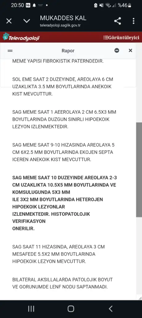 Cerrah her iki memenin de alınmasını önerdi. Memenin tamamını alacak. Emin değilim belkide hiçbişey çıkmayacak ama ben böyle düşünüyorum diyor hiç birşey anlamadık. Başka bir doktora gidicez. Ve acil değil dedi karar verin alalım dedi.Mammografi ve meme ultrasonografisi raporlarını okumadan (Hatta bu hasta için MR bile çekilebilir.), muayene etmeden yorumlamak zor olmakla birlikte bu kitlenin patolojisi kötü huylu hastalık şüphesi taşıyor. Kişisel kanaatim kitlenin çıkarılması için ameliyat, ameliyat sırasında patolojik incemeye göre karar verme veya kitle çıkarılıp patolojik incelemeyle net tanıya ulaşılmasıdır.