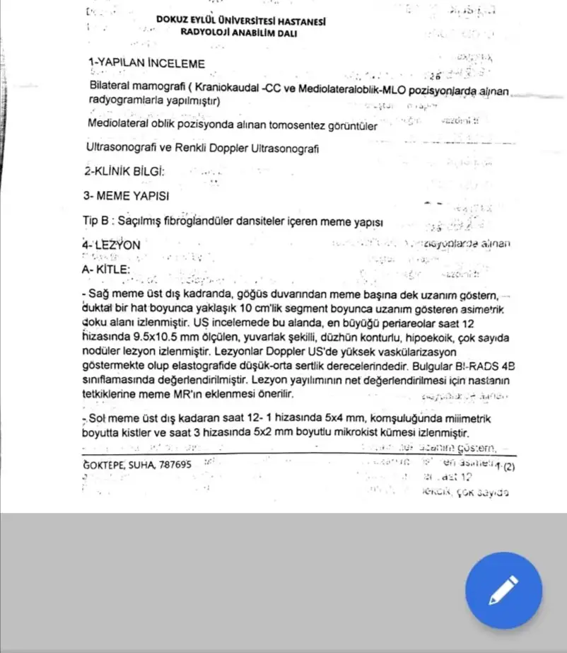 Hepsi yapıldı mamografi usg mr hemen yükleyeyimMammografi ve meme ultrasonografisi raporlarını okumadan (Hatta bu hasta için MR bile çekilebilir.), muayene etmeden yorumlamak zor olmakla birlikte bu kitlenin patolojisi kötü huylu hastalık şüphesi taşıyor. Kişisel kanaatim kitlenin çıkarılması için ameliyat, ameliyat sırasında patolojik incemeye göre karar verme veya kitle çıkarılıp patolojik incelemeyle net tanıya ulaşılmasıdır.