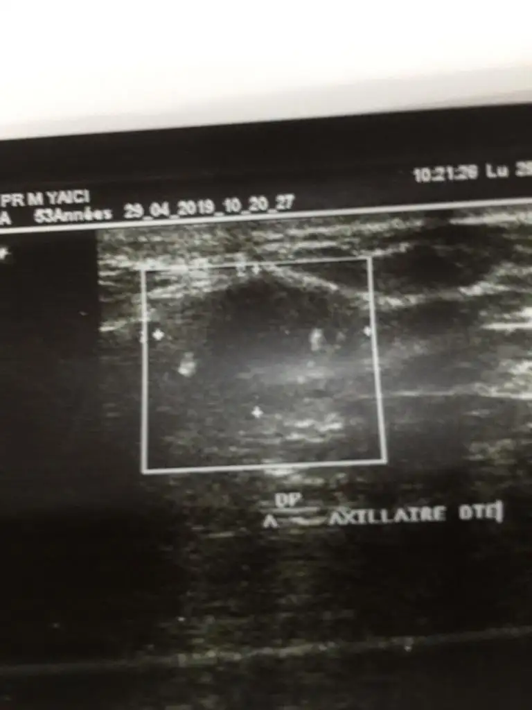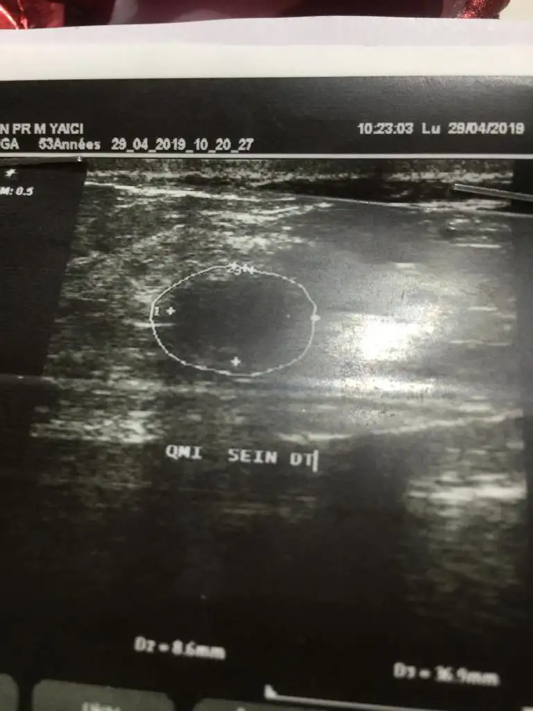 Anneme yapılan ultrason sonucunda ( 53 yaş) sağ göğsünün orta alt kadranında 12.2/8.8 mm çapında ve yine sağ göğsünün orta alt kadranın çevresinde 36.9 mm olan sınırları düzensiz, sert, heterojen yapıda şüpheli bir oluşumun olduğu tespit edilmiştir.