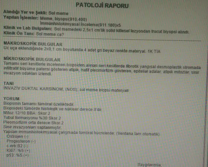 sağ memede sıkıntı yok solda var 3 cm demiştin sanki gogus koruyucu dediğim şey gogus alınmadan gogus teki kitlenin alınması ve etrafının temizlenmesidir eğer bu amaliyat a uyarsa kitleniz göğsü almalarına gerek kalmaz silikon da gerek kalmaz yani okadar karamsar olma sana çocuğun olmayacak demiyorum doktorla görüş tahmin ettiğim gibi menopoza girmen gerekli derse tedavilerde önce yumurtanı dondurursun ilerde çocuk sahibi olabilirsin allahım izniylecevapladigin icin cok tesekkur ederim ekreusg sonucum var. doktorum biopsi sonucundan once yorum yapmak istemedi ama bekleyemiyorum. bu sonuca gore bir yorum yapabilir misin? bir de memenin gogus koruyucuyausaot olup olmamasi nasil oluyor. bu arada size de cok gecmis olsun. hep derdim anne olmadan ölmeyeyim diye... hayat iste nasip degilmis