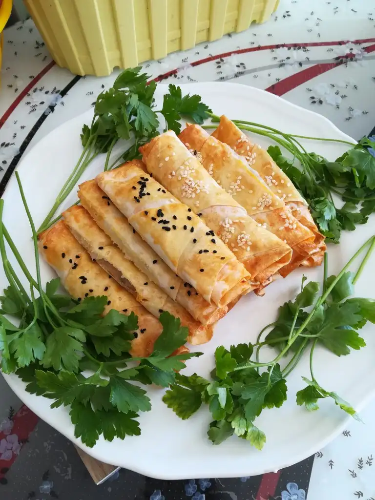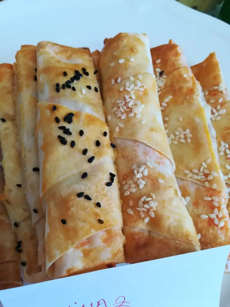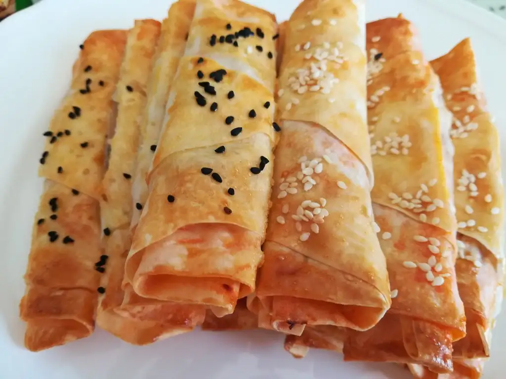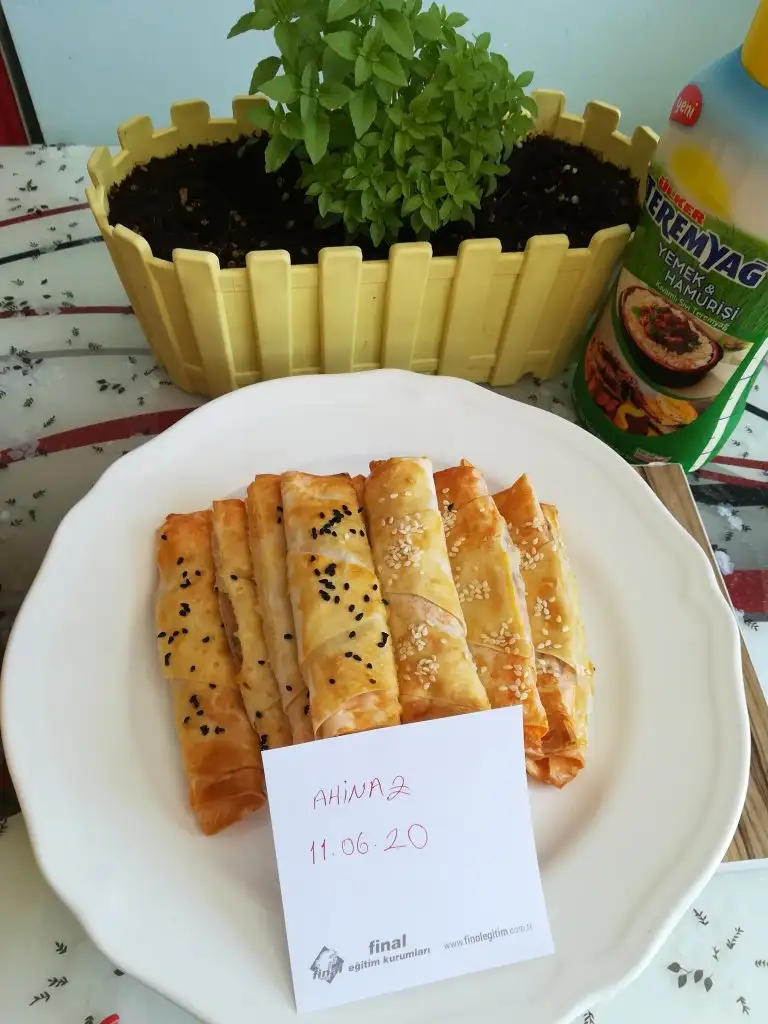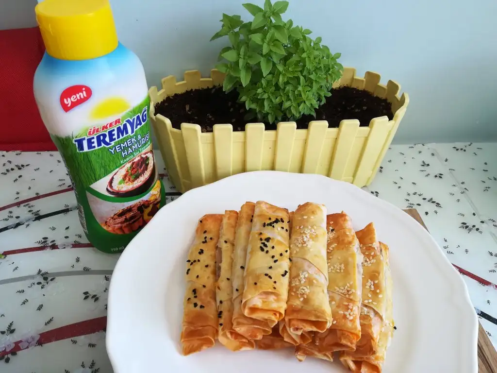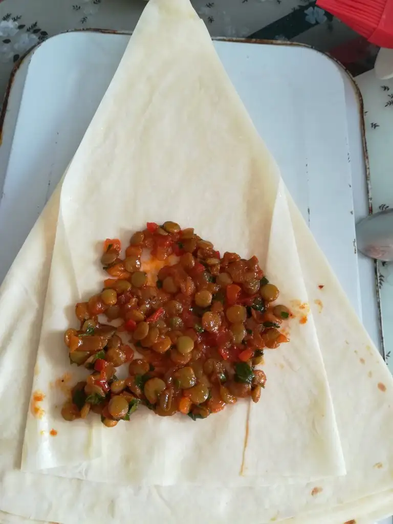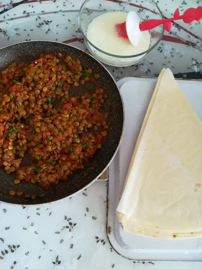 Daha sonra salçası eklenip, kokusu çıkana kadar kavrulur. Üzerine haşlanmış mercimeklerde eklenir. Damak zevkine göre baharatlanır.Üzerine yarım su bardağı sıcak su eklenip, birlikte lezzetleri harmanlansın diye suyunu çekene kadar yaklaşık 5 dk pişirilir. Hazırlanan harç bir tarafta soğumaya bırakılır. Diğer taraftan sosun bütün malzemeleri ayrı bir kapta karıştırılır. Ve sarmaya geçilir. Öncelikle yufkanın her tarafı fırça yardımıyla sos sürülür üçgen yufkanın iki kenarı içeriye doğru katlanır, ve 1 yemek kaşığı kadar harç eklenip, sarılır. Tüm yufkalara bu işlem uygulanır ve fırın tepsisine dizilir. Üzerlerine yumurta sarısı sürülüp, isteğe göre susam veya çörek otu serpilir. Önceden ısıtılmış 180 derece fırında yaklaşık 20-25dk yufkalar pişene dek pişirilir. Ve böreğimiz hazır. Denemenizi tavsiye ediyorum. Şimdiden afiyet olsun :kk77: