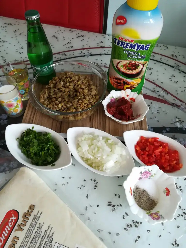 360 GRAM YUFKA(bimde hazır satılan üçgen yufka) 1 SU BARDAĞI HAŞLANMIŞ YEŞİL MERCİMEK 1 ORTA BOY SOĞAN 1 KAPYA BİBER 1 YEMEK KAŞIĞI SALÇA 2 YEMEK KAŞIĞI TEREMYAĞI MAYDANOZ, TUZ, KARABİBER