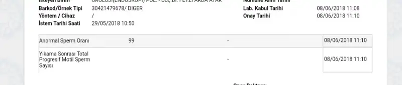 Biz türkiyedeyken sürekli ilaçları verdiler ama kanda hormonlar yükselirken, spermin sayısı, miktarı ve morfolojisi bozuldu. Bu sebeple tıkanıklıktan ve prostattan şüphelendiler ve ultrason için tarih verdiler.