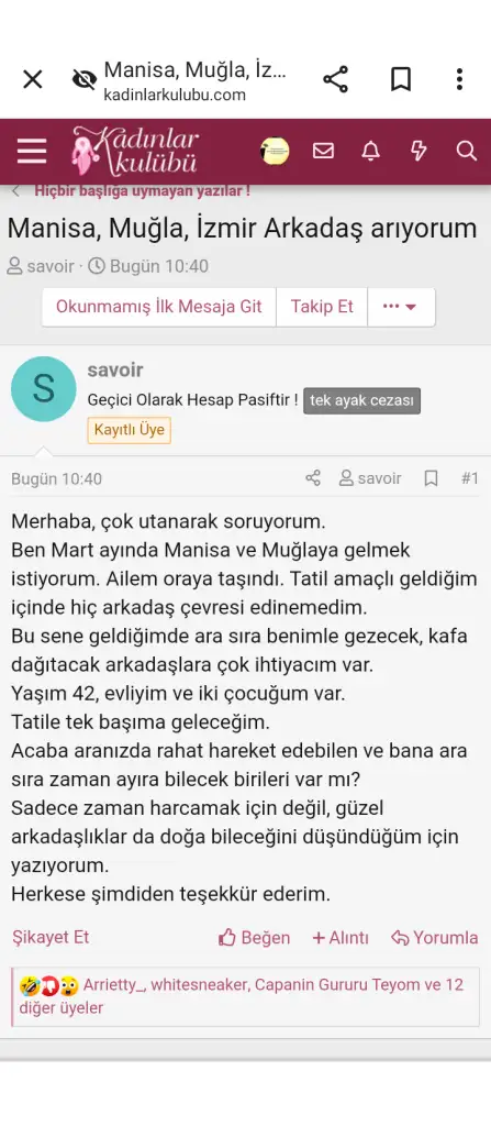 Aslinda sormaktan cekindigim konu şu. Cok degil 2-3 arkadasim olsa cok mutlu olurum diye dusunuyorum. Karsiyaka da oturuyorum. Insana insan lazim. Yalnizlik Allah a mahsus. Benim gibi belki yalniz anne olup gerek Izmir de gerek Karşıyaka da ikamet eden birileri ile tanismayi cok isterdim. Bende kendimde hemen guvenen biri asla degilim zaten yani once iyice tanimayi isterim msj ile sonra tlf ile. Sonra anca yuzyuze gorusulurdu diye düşünüyorum. Karsi tarafta oyle yapmali tabii. Umarim kirici olmadan yol gosterirsiniz. Cunku son damlaya gelince buraya konu acmaya cesaret edebildim. Rabbim hepimizin karsisina hayirli iyi insanlar cikarsin. Simdiden teşekkür ederim cevaplariniz icin 🙏🌺
