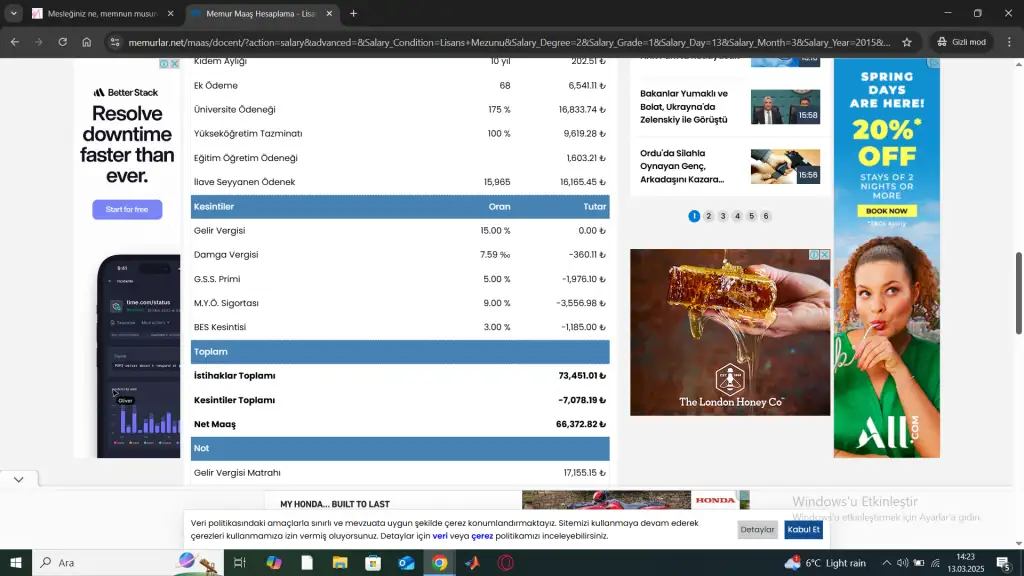 Doçent maaşı 70 bin mi hiç ek ödeme vs yok mu çok az geldi bi arkadaşım özel ünide araştırma görevlisi o bile 80 alıyormuş ve projeye göre ödemesi artıyormuşevet ama günümüzde üniversitelerimizin durumu bu doçent maaşı 70 bin ve şişli belediyesi zabıta maaşları 85 bin. güvenlik görevlilileride sözleşmeli tarzı bir durum varmıs üniversitemizde asagı yukarı bizim ile aynı alıyorlar gercek durum bu. akademi maaş konusunda berbat hale geldi
