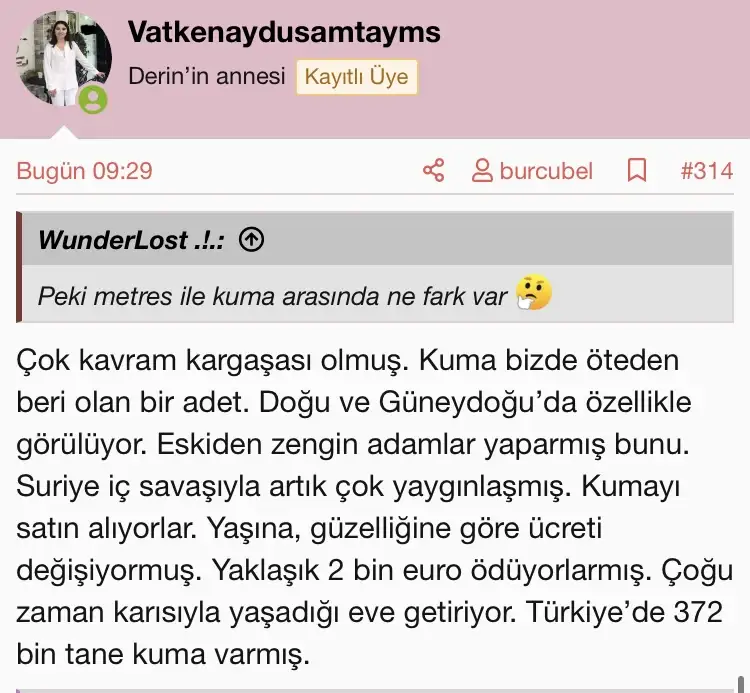 Kendimi alıntılayamıyorum. İlk mesajda özellikle “Doğu ve Güneydoğu” demişim. Sadece bunlarda dememişim. Daha sonra makalede Kumanın en sık olduğu yer Şanlıurfa yazılmış. Ve bu eskide kalmamış. Suriye iç savaşıyla daha da yaygınlaşmış. Kadını satın almak için verilen rakam düşmüş.Tamam her yerde var aama diğer arkadaş direk güneydoğu doğu da adet bu diyo.