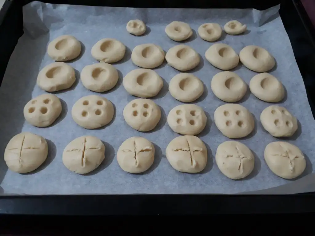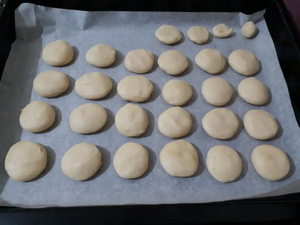 Yağlı kağıt serili tepsimize yuvarlak ama hafif yassı olacak şekilde diziyoruz.