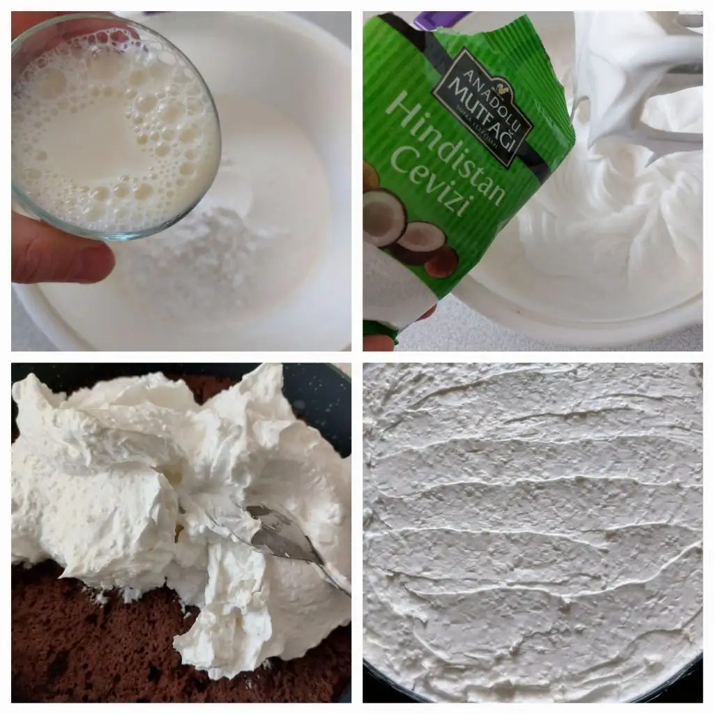 🍒 Kremşantiyi tarife göre yapıp içine pudra şekeri ve Hindistancevizi ekleyip yoğunlaşan kadar çırpıyoruz. Kekin üzerine eşit şekilde yayıyoruz dolaba alıyoruz.