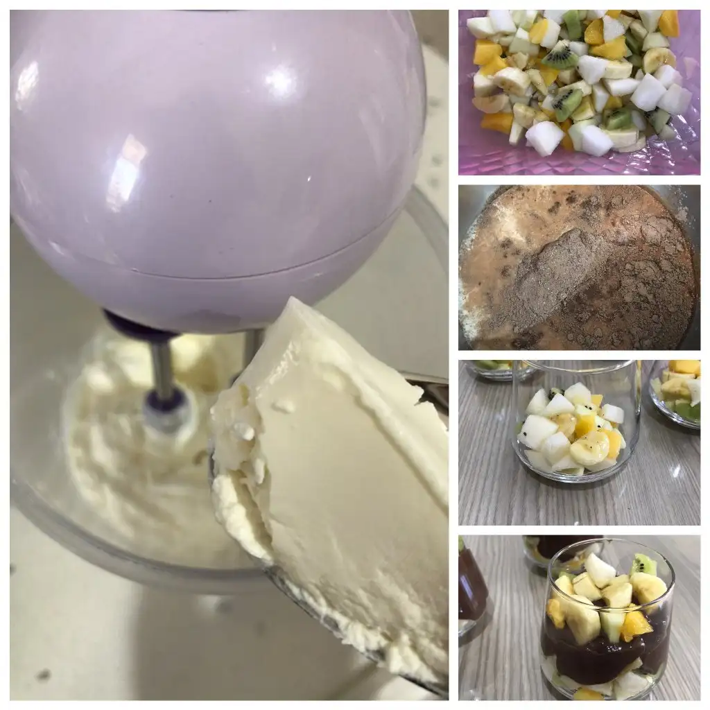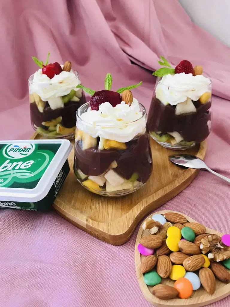 önce meyveleri küp küp doğrayıp bir kasede birleştirelim Ve kenara alalım. Sonra krem şantimizi tarifindeki gibi sütle yaparak dolaba kaldıralım. (Ben labneyi krem şantiye koydum, harika Oldu. labne koyduğum için de krem şantiye sütü 1 bardaktan biraz az koydum)