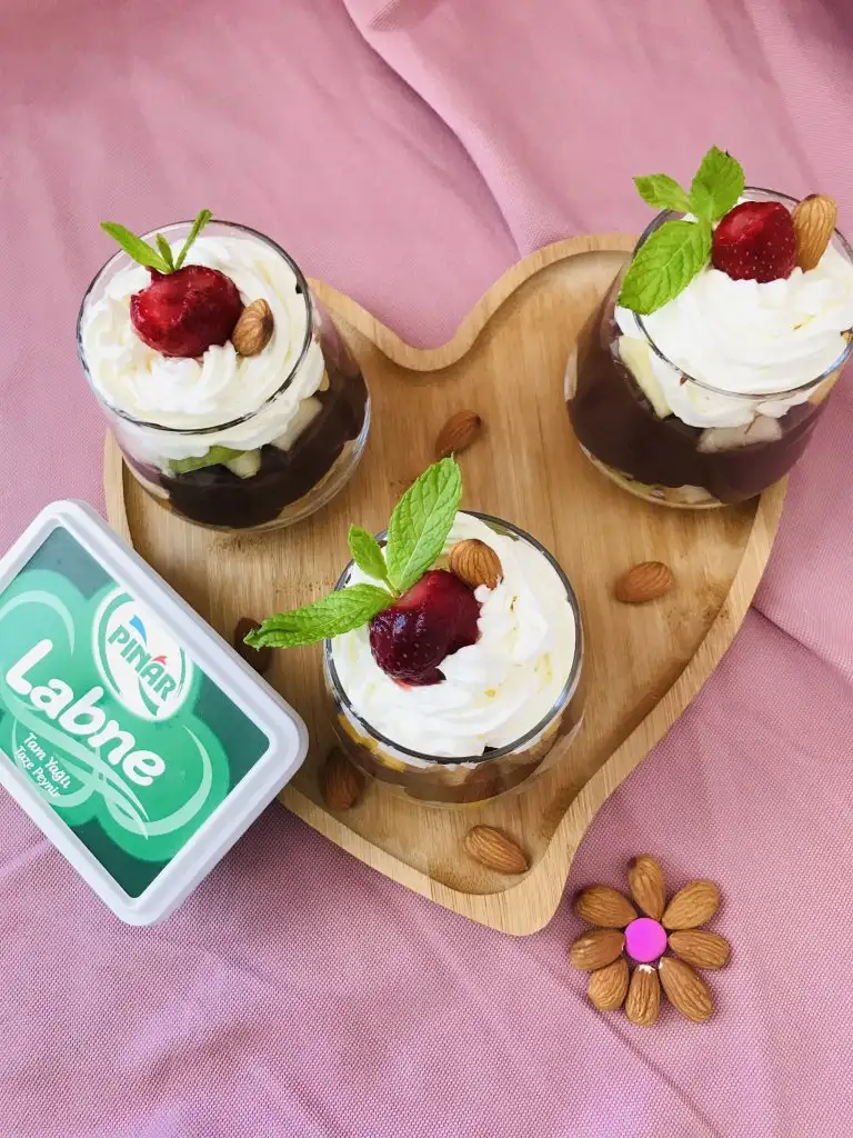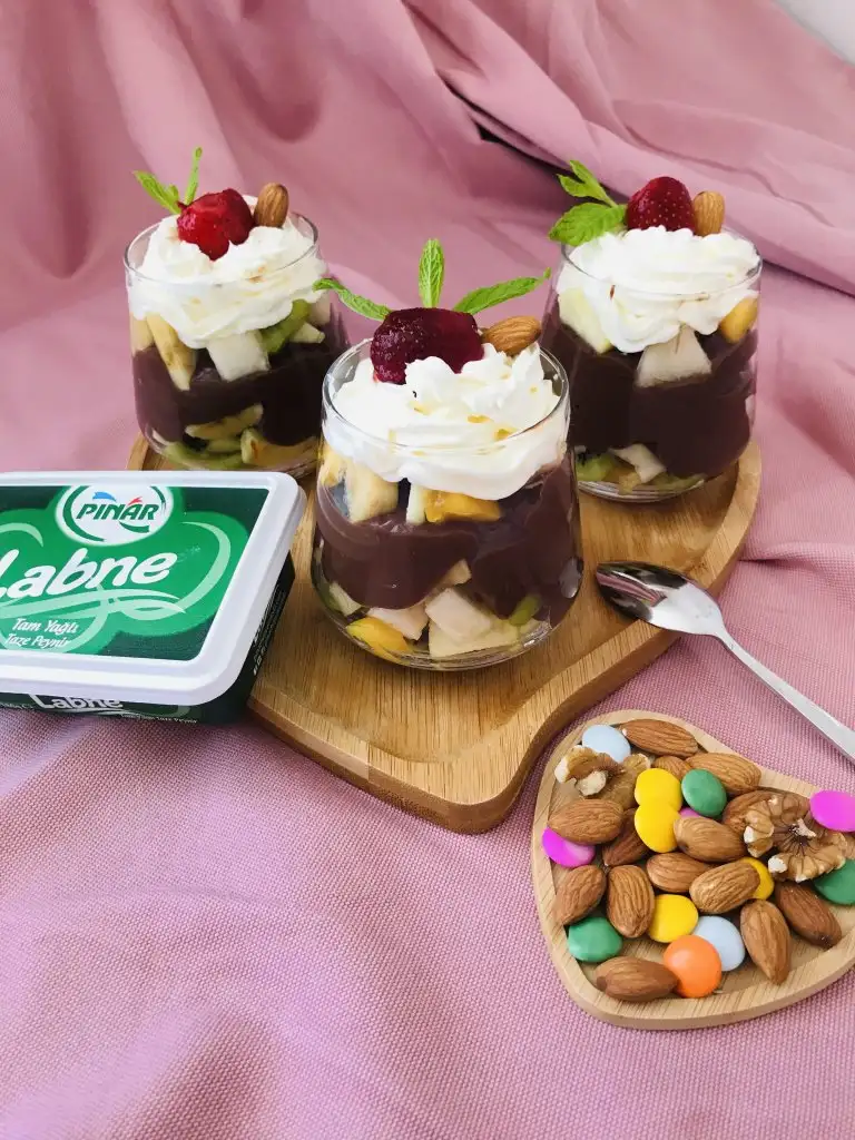 Bardaklarımıza bolca meyve koyup üzerine pudingimizi ekleyelim. Tekrar meyve koyalım. en üstüne de labneli krem şantimizi sıkalım. Çilekle süsleyip servis edelim. Sanki meyveli yoğurt gibi oldu. Acayip hafif bir tatlı. 2 bardak yesek kesmez herhalde. afiyet olsun