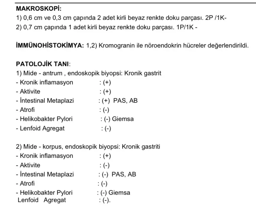 Merhaba hanımlar bir ay önce gastroskopi yaptırdım biyopsi sonuçlarım çıkmış doktor bir kaç hafta yok o yüzden gidemiyorum bilen varsa bakabilirmi endişeleniyorum