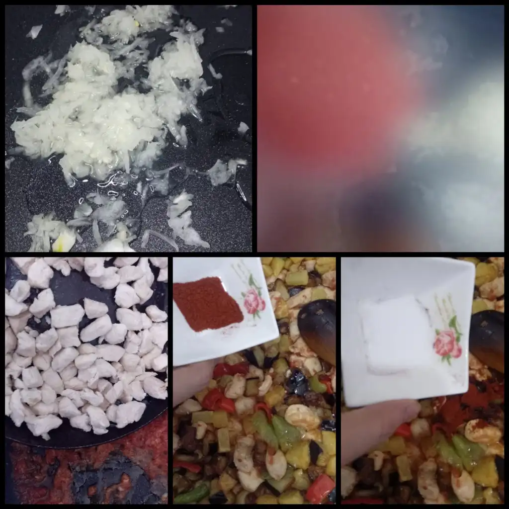 Ayrı bir tavaya rendeledigimiz soğanı yine iki kaşık sıvıyağ ile kavurup ,domates sosumuzu ekliyoruz.Ardindan tavuk eti ve kizarttigimiz sebzelerimizi ekleyip harmanliyoruz. Son olarak da tuz ve baharatın ekleyip altını kapatıyoruz.