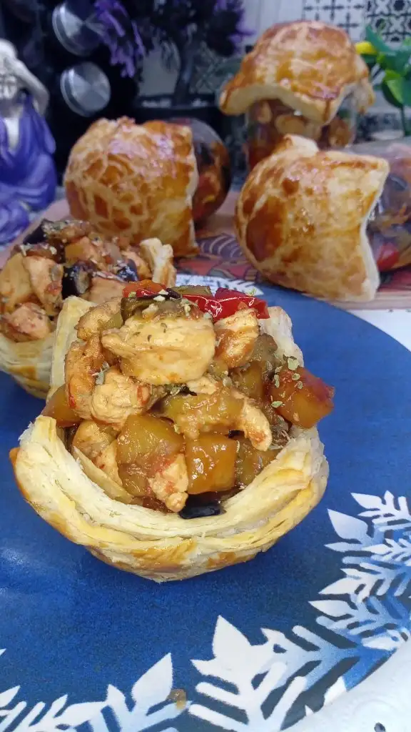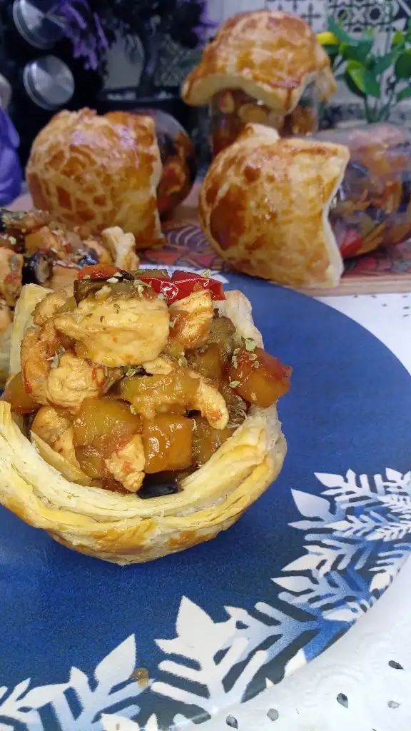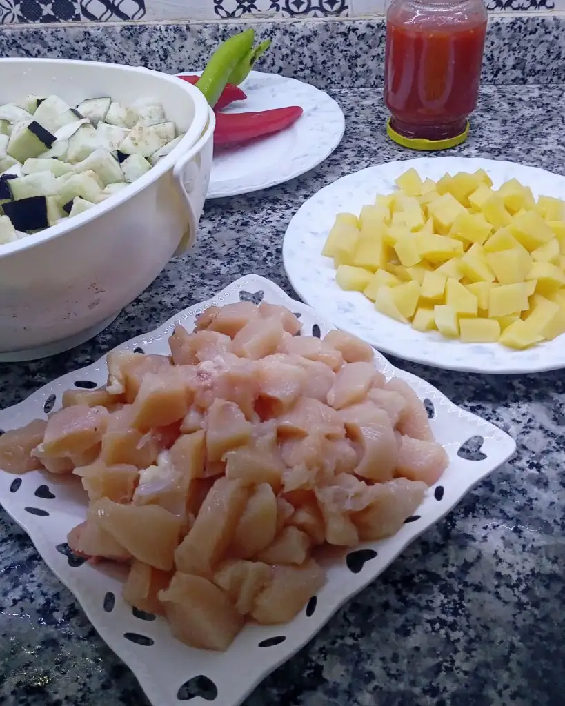 Ayrı bir tavaya rendeledigimiz soğanı yine iki kaşık sıvıyağ ile kavurup ,domates sosumuzu ekliyoruz.Ardindan tavuk eti ve kizarttigimiz sebzelerimizi ekleyip harmanliyoruz. Son olarak da tuz ve baharatın ekleyip altını kapatıyoruz.