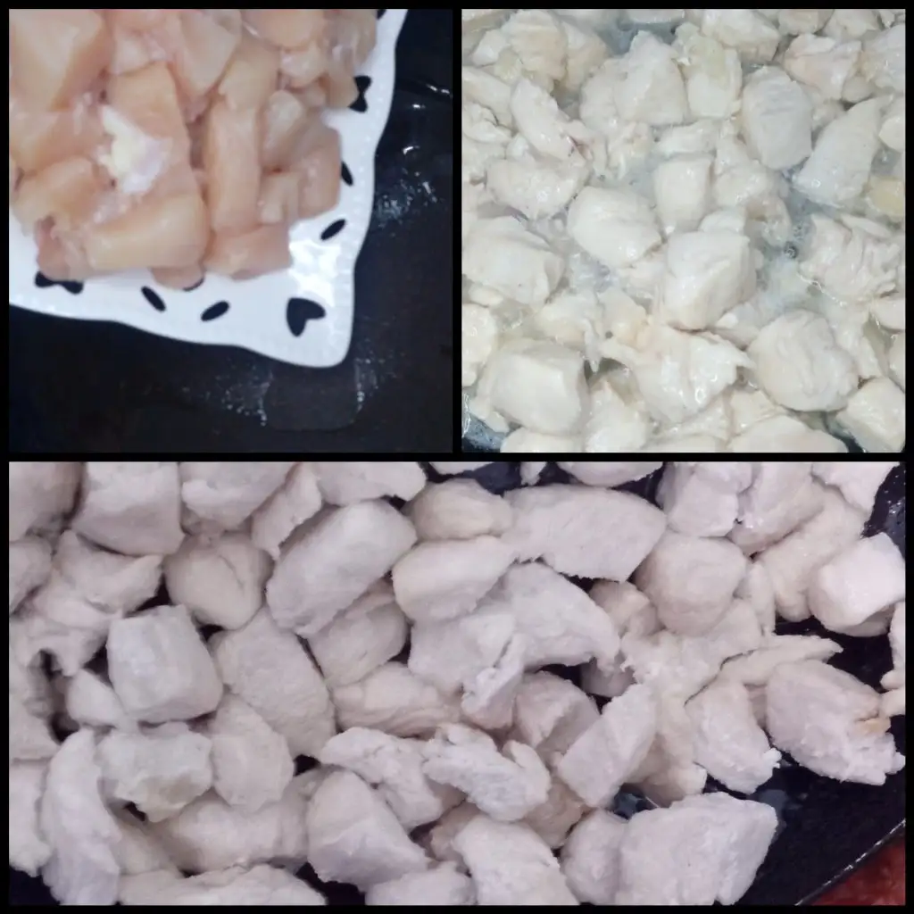 Öncelikle kuşbaşı dogradigimiz tavuk etini iki kaşık sıvıyağ ile tavada bir iki çevirdikten sonra ,suyunu salıp,çekince altını kısıp 15,20 dk kavuruyoruz.