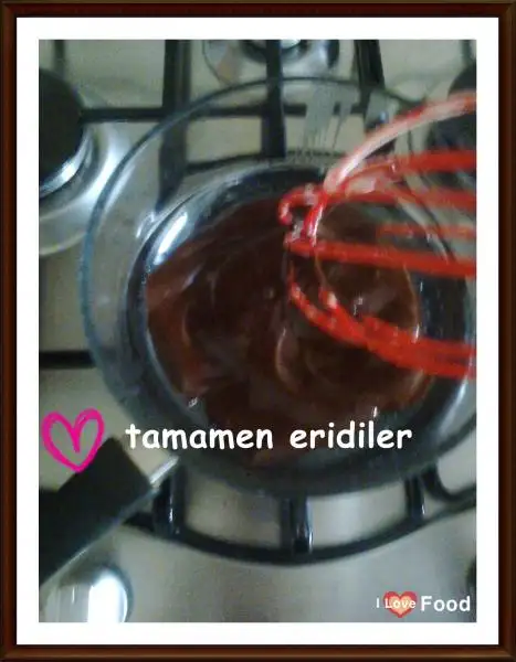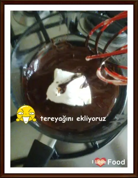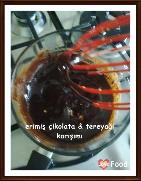 Eriyen çikolatanın üzerine 2 yemek kaşığı tereyağı ilave edip eritiyoruz.