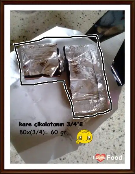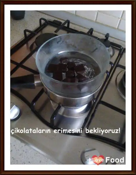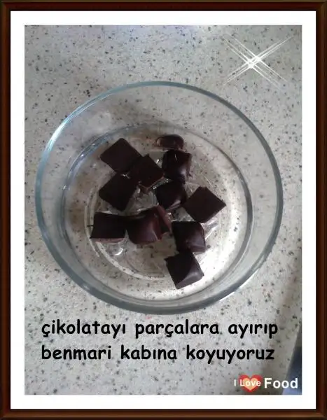 Öncelikle 80 gramlık kare çikolata paketinin 3/4'ünü minik parçalara bölüp benmari usulü eritiyoruz.