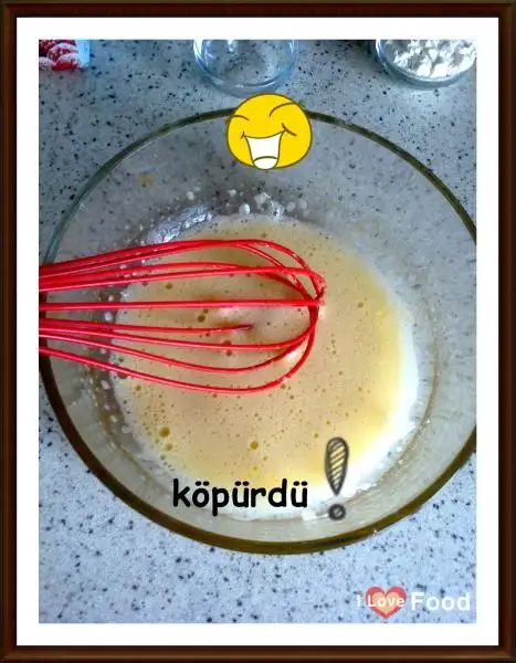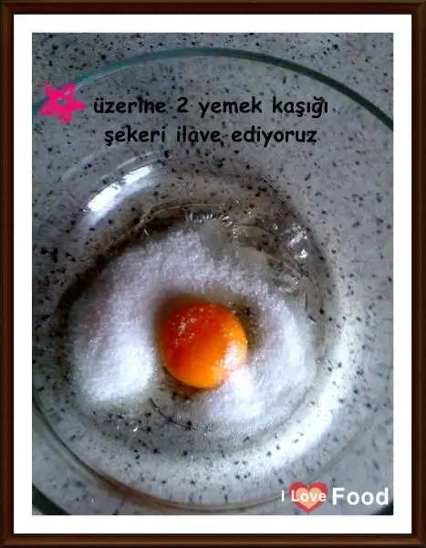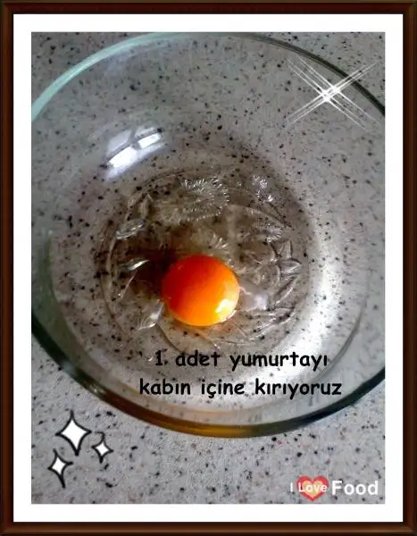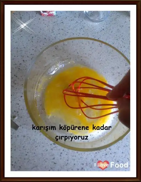 Ayrı bir kapta 1 yumurtayı kırıp 2 yemek kaşığı şekerle köpürene kadar çırpıyoruz.