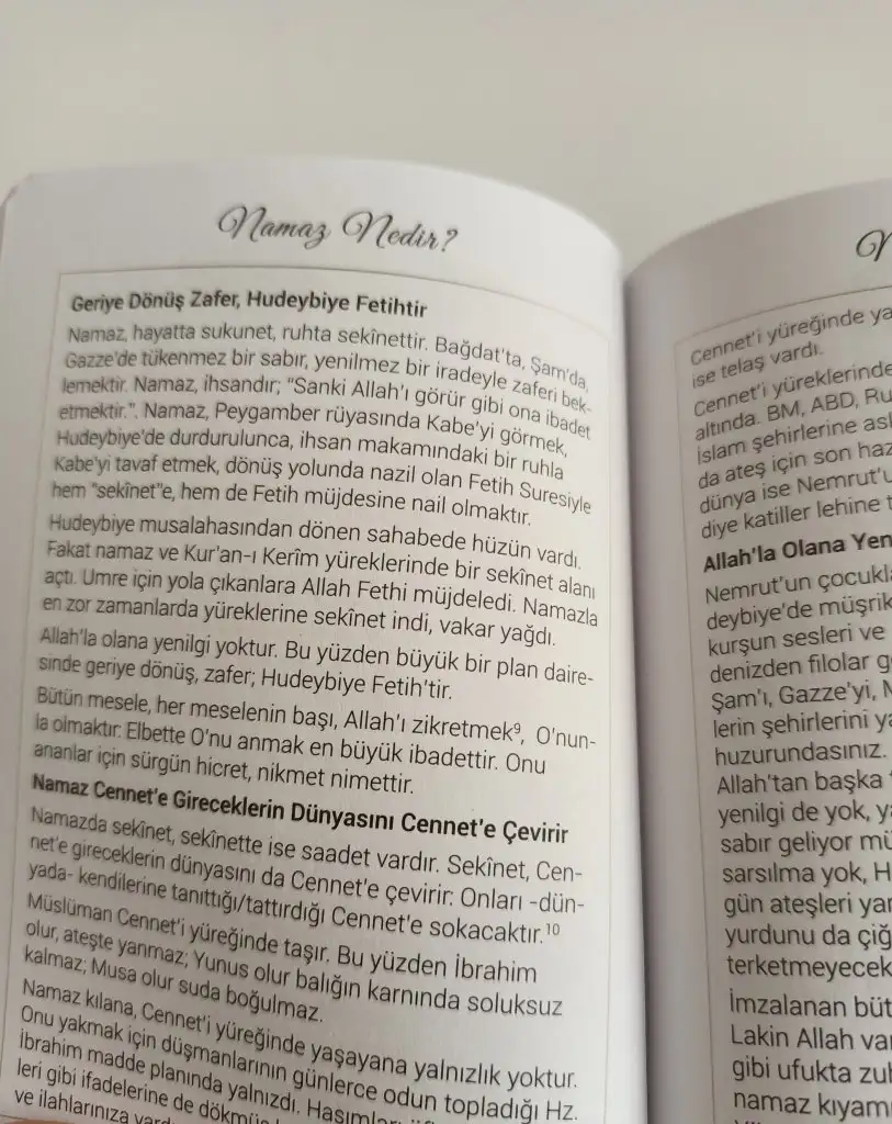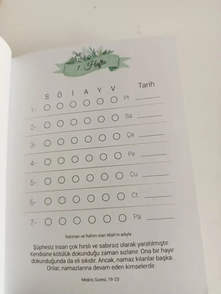 fotoğrafını atabilir misin nasıl bir şey?Ama benim namaza özel bölüm yok. Ayrıca namaz/oruç çizelgesi aldım. O da not defteri gibiymiş avuç içi kadar.