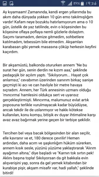 Ve ben bu yaziya asla katilmiyorum. Eskiler cocuklarini daima dogru büyütmüyordu. O yedigim dayaklar, azarlamalar, baska cocuklar ile karsilastirmalar,..bende travma yaratti.