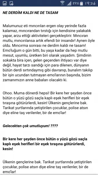 En ufak bı azara bile kiziliyor burda dedim farkındaysanız. Yazıda gayet açıklayıcı ve konuylada bağlantılı bence aslında çocukların eskiden bizler nasıl büyütlduysek öyle buyutulmesı gerektiğini vurgulayan şahane bi yazı. Şimdilerde anneleri görüyorm aman pskolojisi aman susu aman busu çocuk resmen kendini evin reisı ilan etmiş durumda söz geçmiyor. Ben suanki cogu annenin çocuk yetistirme şeklini begenmiorm. Benim gibi dusunmeyenlerin düşüncelerinede saygı duyuyorum