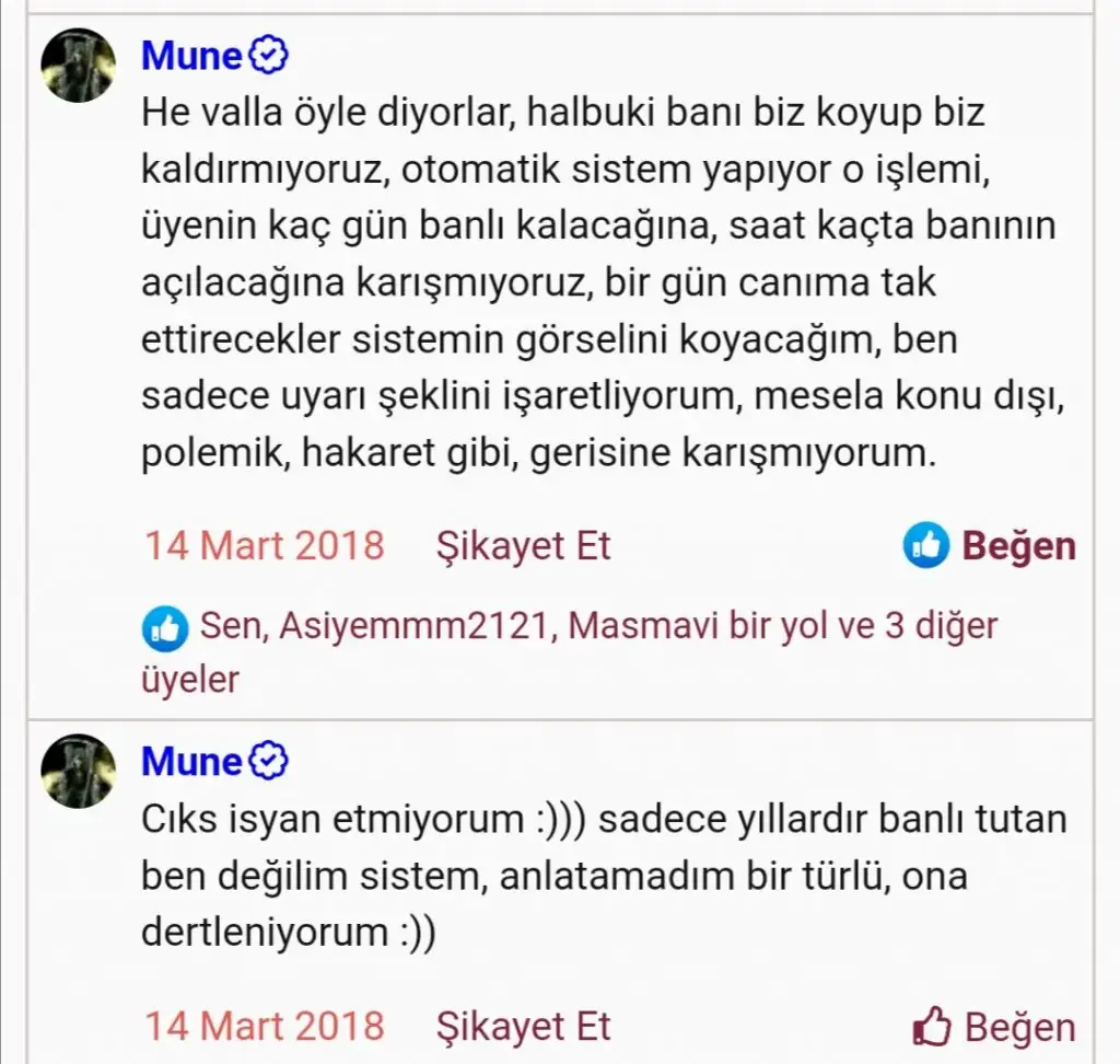 Fake üyelik prosedürü farklıdır, üyelerin polemik, üslup vb sebeplerle banlanmaları başka, fake veya erkek üyelik şüphesiyle şikayet başka bir şey, ki fake ya da erkek üyelik şüphesinde üyenin açtığı konu içeriği değerlendirilir, bazı konular gerçek olmayabilir diye düşünülüp üyelik askıya alınabilir zira ben de size bir konu hatırlatayım X bir üye burada epey bir arkadaş edindikten sonra, sözde arkadaşı tarafından öldüğüne dair açıklama yapılmıştı, üyeler şaşkına dönmüştü, bazı üyeler kişinin yaşadığı yerdeki mezarlıklar müdürlüğünü dahi aramıştı, peşinden eşi olduğunu söyleyen biri evet eşim öldü dedi, sonra tüm üyeliklerin öldüğü söylenen kişiye ait olduğu ve aslında üyenin ölmediği ortaya çıktı.