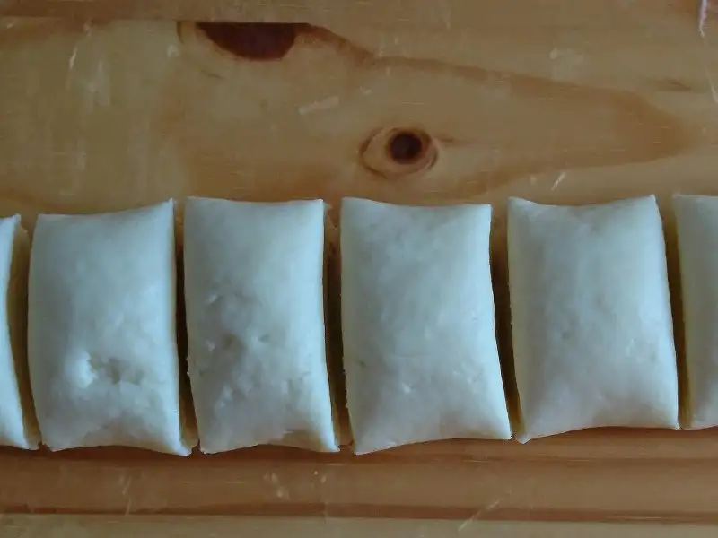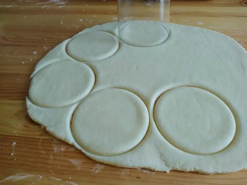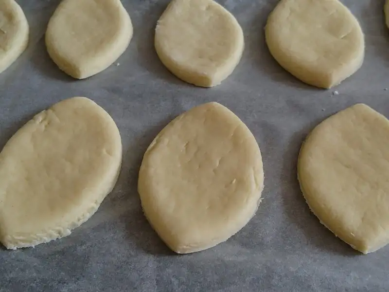 - Hamuru 2 parçaya bölüp, bir parçasını merdane ile açıp, geniş bir bardakla oval şekil veriyoruz. (Direk kalıp ile de bu şekli verebilirsiniz)