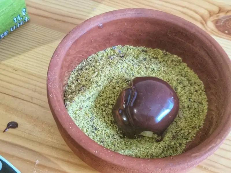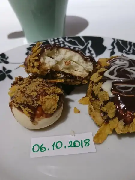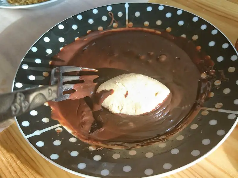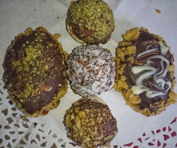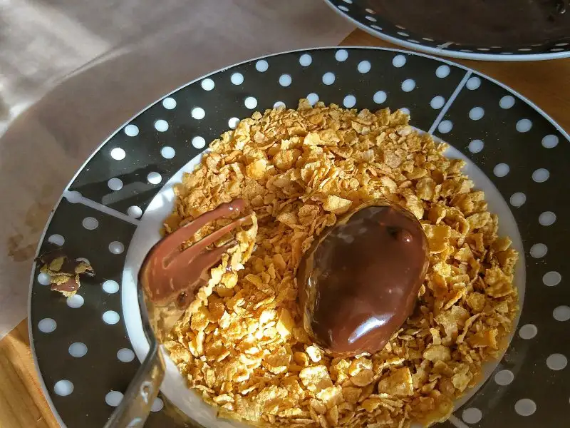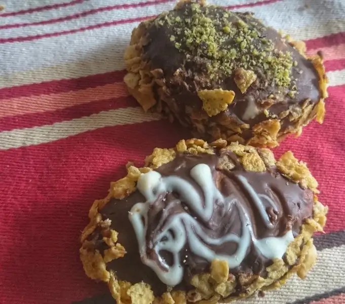 - Fırından aldıktan sonra benmari usulü eritilmiş sütlü çikolataya (2 yemek kaşığı Nutella ve 3 yemek kaşığı süt ekliyoruz koyulugu gitsin diye) batırıp ardından ufaladigimiz mısır gevreğine buluyoruz.