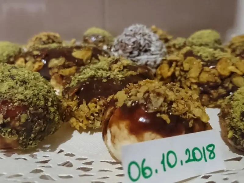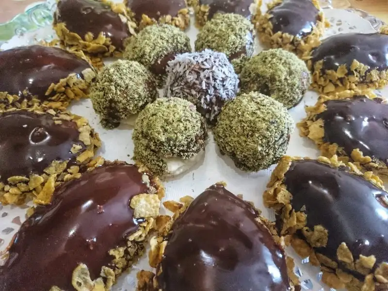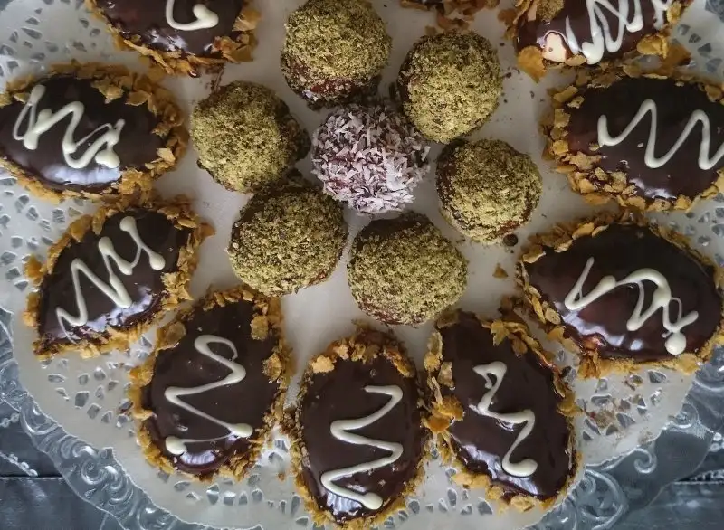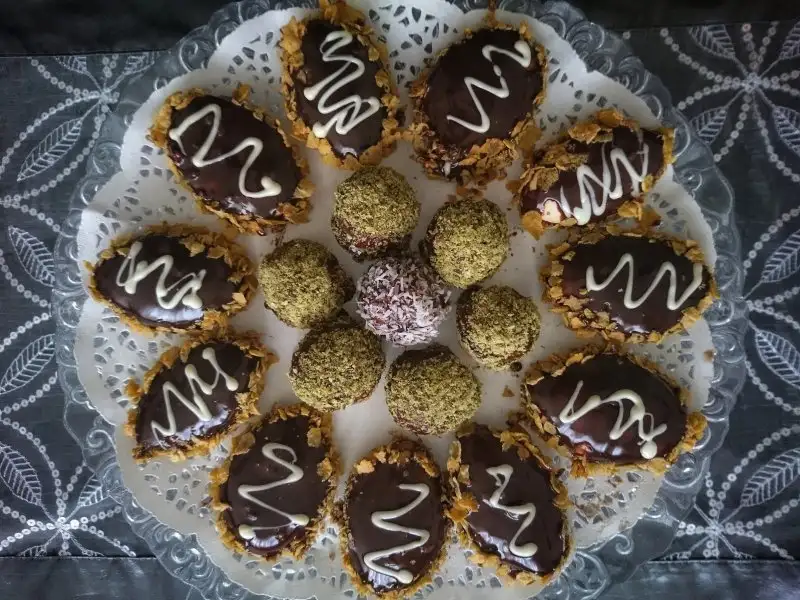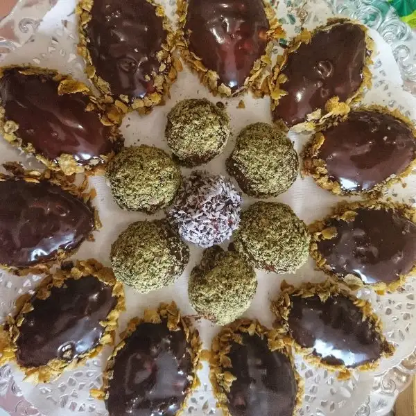 - Hepsini kurumaya bırakıp üzerini dilediğimiz gibi süslüyoruz. Beyaz çikolata, toz fıstık ve hindistan cevizi kullandım ben.